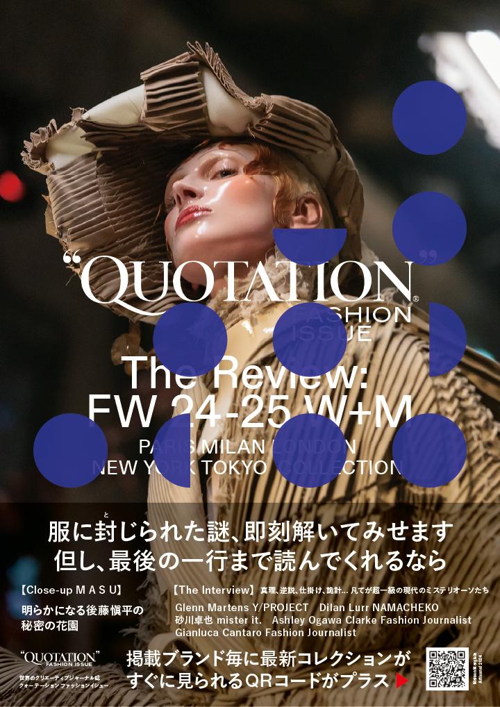 QUOTATION FASHION ISSUE vol.40The Review:FW 2024-25 WOMENS / MENSPARIS MILAN LONDON NY TOKYOCOLLECTION服に封じられた謎、即刻解いてみせます但し、最後の一行まで読んでくれるなら特集企画Close-upM A S U明らかになるの秘密の花園The interview真理、逆説、仕掛け、設計…すべてが超一級の現代のミステリオーソたちY/PROJECT Glenn MartinsNAMACHEKO Dilan Lurrmister it. 砂川卓也Fashion Journalist Asley Ogawa ClarkeFashion Journalist Gianluca Cantaro“QUOTATION”.tokyo