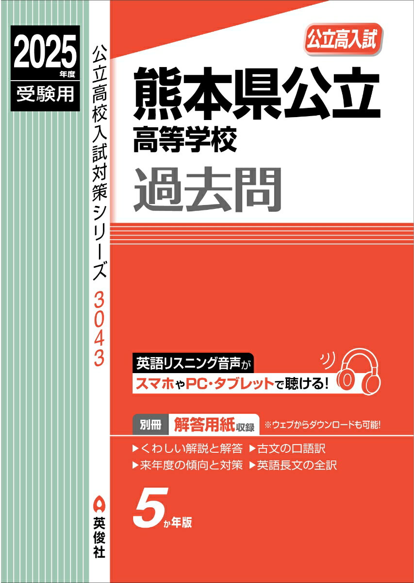 英俊社の赤本では最新5年分(2020年〜2024年)の熊本県公立高校 の入試問題を収録しています。書籍に掲載の試験種別については,「もくじ」のページをご確認ください。【公立高校入試対策シリーズ(赤本)の特長】○見やすくレイアウトされた問題○くわしい解説一度やってみたけどできなかった問題,間違えた問題をきちんと復習し,理解することが合格への近道です。そのため赤本では間違えた問題を復習できるようにくわしく,わかりやすい解説をつけています。また,解説だけでなく英語長文の全訳,古文の口語訳も掲載していますので,ぜひ学習に役立ててください。○解答用紙について解答用紙は別冊になっているので,本体から取り外しが可能です。書き込みしやすく勉強しやすい作りになっています。さらに,英俊社ウェブサイトからダウンロードすることができるので,繰り返し入試問題に取り組むことができます。○リスニング音声について赤本に掲載の全年度のリスニング音声は,PC・スマホで英俊社ウェブサイトから再生することができます。※再生に必要なコードは書籍に記載しています。※コードの使用期限: 2025年7月末日○受験に役立つ入試情報を掲載入試の仕組みや前年度の入試データなど,入試問題以外にも受験に役立つ情報を掲載しています。○傾向と対策書籍に掲載されている過去の出題分析から入試の傾向をつかみ,入試対策の参考資料として活用しましょう。ーーーーーーーーーーーーーーーーーーーーーーーーーーーーーーーーーーーーーーーーーーーーーーーーーーーーーーーーーーーーーーーーーーーーーーーーーーーーーーーーーーーーーーーーーーーーーーーーーーーーーーーーーーーーーーーーーーーーーーーーーーーーーーーーーーーーーーーーーーーーーーー●昭和・平成・令和と時代は変わっても過去問といえば赤本1974年(昭和49年)の創業以来,中学・高校入試対策に特化した出版社として,数多くの学校,公立高校の過去問(赤本)を出版してまいりました。英俊社の赤本でしっかりと過去問に取り組んでいただき,合格を勝ち取ってください!ーーーーーーーーーーーーーーーーーーーーーーーーーーーーーーーーーーーーーーーーーーーーーーーーーーーーーーーーーーーーーーーーーーーーーーーーーーーーーーーーーーーーーーーーーーーーーーーーーーーーーーーーーーーーーーーーーーーーーーーーーーーーーーーーーーーーーーーーーーーーーーー