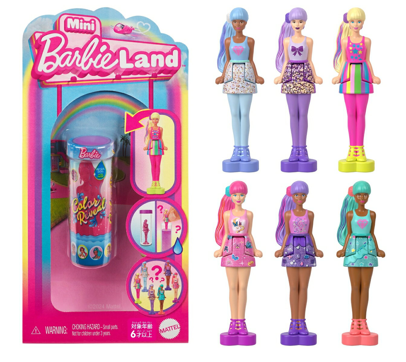 【内容】ピンクのコーティングがついたマイクロドールを水に入れたケースに入れて振ると、約3.81cmのバービーが出てきます。バービーのカラーリビールシリーズをモデルに作られたマイクロドールは全部で6種類、水に入れてコーティングをはがすまで、何が出てくるかわからないサプライズトイ!マイクロドールにはハート型の台座がついており自立し、座らせることもできるので、同じシリーズののりものやハウスと一緒に遊べます。6種類まとめて一度に揃う大人買いセット。ミニバービーランドの他ののりものやハウス、マイクロドールを集めて自分のミニバービーランドを作ろう!【原産国】中国 【対象年齢】6歳〜【ごっこあそび】ごっこ遊びを通じて、お子様の想像力を育てることで、You Can Be Anything (何にだってなれる)というバービーが届けるメッセージの通り、想像力から将来の夢を描き、将来の“可能性”を広げるサポートをします。【Brandについて】世界中で遊ばれているファッションドール。【バービー:Barbie】バービーは世界中で愛されている着せ替え人形(ドール)です。2023年にはグレタ・ガーウィグが監督しマーゴット・ロビーがバービーを演じる、映画『バービー』もついに公開!大人がおしゃれなコレクションとして買い求めるバービーコレクターラインも充実しており、世代を超えて、女性の夢をかなえるファッションドールとして愛されています。バービーは約200種類の職業や、インスピレーションを与える人物像、数えきれないほどのファッションやアクセサリーを通して女の子の”可能性”を提示してきました。女の子の”可能性”を広げる"You Can Be Anything”(何にだってなれる!)のメッセージを発信し、この取り組みを続けていきます。【プレゼントに最適】お誕生日、クリスマスプレゼント、入園・入学祝いなど記念日でのプレゼントにぴったりです。【対象年齢】:6歳以上【商品サイズ (cm)】(幅×高さ×奥行):7.6×15.2×2.9