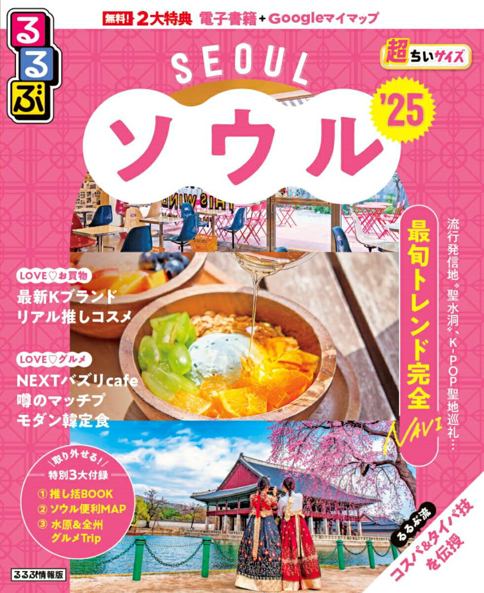 ◎スマホやタブレットで使える便利な電子書籍付き◎るるぶ流コスパ&タイパ術を伝授!◎持ち運びに便利なミニサイズ(縮刷版)【巻頭特集】“今行きたい”にあふれた最高のソウル旅へ!もはやマスト!トレンド発信地“聖水洞”&注目エリア最新案内グルメ通がこっそり教える 噂のマッチプ(おいしいお店)“韓国っぽ”な体験リスト最旬トレンドカフェガイド最新ニュース&トピックス【買う】最新コスメハントKファッションの人気ブランドをチェックプチプラアパレルアイテムはココで買う!人気キャラグッズはマストバイかわいい韓国雑貨に囲まれたいプチプラバラマキみやげ【食べる】ジャンル別必食リスト!肉料理(豚、鶏、牛)/湯(スープ)/麺料理/鍋料理/カニ エビ/ 朝ごはん/モダン韓食/市場ごはん/ワイン、おしゃれバー/ベーカリー/スーパー、コンビニ/テイクアウトグルメ【観る:遊ぶ】ロッテタワー古宮、博物館&美術館夜景スポット【ビューティー】トレンドビューティースポット/韓医エステスパ/チムジルバン/汗蒸幕【エリアガイド】聖水洞・ソウルの森/カロスキル/狎鷗亭江南/弘大・延南洞・望遠洞/明洞/仁寺洞/三清洞/梨泰院・漢南洞/東大門/ヨイド/龍山●「るるぶ」は、「みる」「食べる」「遊ぶ」を中心におすすめエリアやスポットを徹底紹介した旅行ガイドブックです。国内・海外あわせて約200のラインナップを展開、2023年でブランド誕生50周年を迎えました!「るるぶ」の特徴はこちら・写真が多くてわかりやすい!・最新情報がたっぷり!・見やすい地図もついてくる!初めて訪れる方からリピーターまで、幅広い方々により旅行を楽しんでいただけるガイドブックです。
