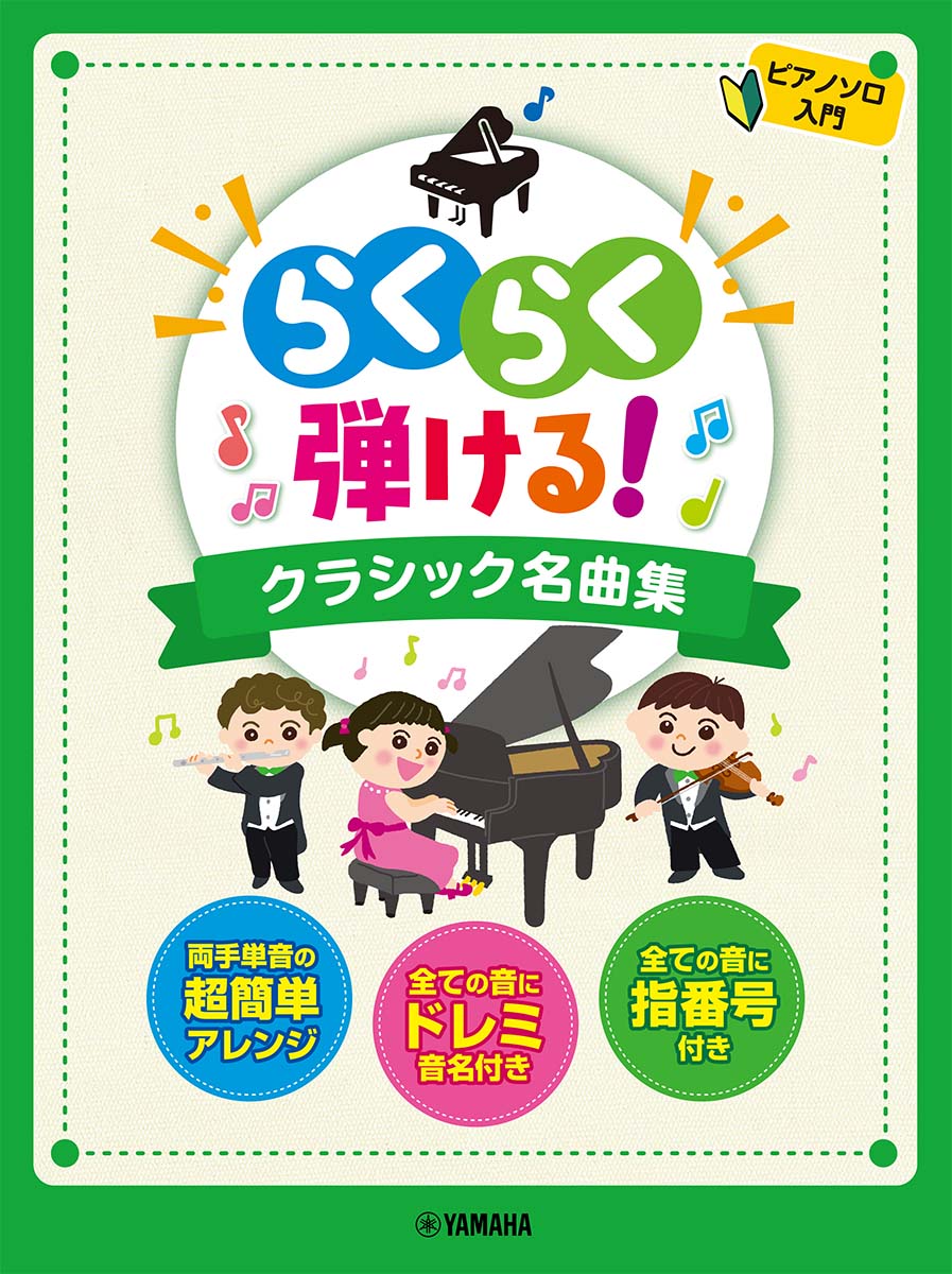 ■本書の特長:すべてにドレミふりがな付き♪指番号と指くぐり、こえなど、ていねいな指づかい表示♪楽譜中に演奏ポイントマークがあり、注意するところが明快♪両手ともに単音で演奏できるカンタンアレンジ♪音楽の基礎知識の充実解説ページ付き♪今回はピアノ曲からオーケストラ作品まで、誰もが知っていてかんたんに弾けるクラシックの名曲を集めました!※本書は「ピアノソロ らくらく弾ける! クラシック名曲集 〜ドレミふりがな&指番号付!〜」(GTP01089810)と同じ内容です。■収載曲 [全30曲を収載][1] よろこびの歌編成: ピアノ・ソログレード: 入門[2] 木星編成: ピアノ・ソログレード: 入門[3] 家路編成: ピアノ・ソログレード: 入門[4] 愛のあいさつ編成: ピアノ・ソログレード: 入門[5] 威風堂々編成: ピアノ・ソログレード: 入門[6] オンブラ・マイ・フ編成: ピアノ・ソログレード: 入門[7] 「悲愴」 第2楽章編成: ピアノ・ソログレード: 入門[8] パッヘルベルのカノン編成: ピアノ・ソログレード: 入門[9] トルコ行進曲編成: ピアノ・ソログレード: 入門[10] G線上のアリア編成: ピアノ・ソログレード: 入門[11] 白鳥の湖編成: ピアノ・ソログレード: 入門[12] モルダウ編成: ピアノ・ソログレード: 入門[13] 別れの曲編成: ピアノ・ソログレード: 入門[14] 見よ、勇者は帰る編成: ピアノ・ソログレード: 入門[15] 美しく青きドナウ編成: ピアノ・ソログレード: 入門[16] エリーゼのために編成: ピアノ・ソログレード: 入門[17] 楽しき農夫編成: ピアノ・ソログレード: 入門[18] ラ・カンパネラ編成: ピアノ・ソログレード: 入門[19] 時の踊り編成: ピアノ・ソログレード: 入門[20] 愛の夢 第3番編成: ピアノ・ソログレード: 入門[21] ヘ調のメロディー編成: ピアノ・ソログレード: 入門[22] ジュ・トゥ・ヴ編成: ピアノ・ソログレード: 入門[23] ト調のメヌエット編成: ピアノ・ソログレード: 入門[24] おもちゃの兵隊の行進編成: ピアノ・ソログレード: 入門[25] 軍隊行進曲編成: ピアノ・ソログレード: 入門[26] 前奏曲 第7番編成: ピアノ・ソログレード: 入門[27] きらきら星変奏曲編成: ピアノ・ソログレード: 入門[28] スケーターズ・ワルツ編成: ピアノ・ソログレード: 入門[29] びっくりシンフォニー編成: ピアノ・ソログレード: 入門[30] 華麗なる大円舞曲編成: ピアノ・ソログレード: 入門