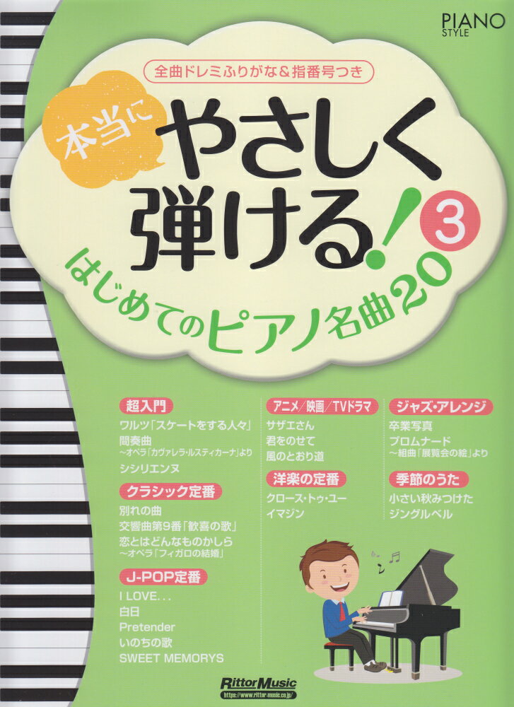 1:■【知っておきたいピアノのこと】 2:姿勢の作りかた/椅子をえらぶ 3:鍵盤と楽譜の対照表/指番号と指使いについて 4:いろいろな表示記号/音符と休符の長さ 5:強弱に関する記号/演奏記号/スコアの読み方 6:曲想に関する代表的な用語/速度に関する記号 7:和音の仕組み/ハーモニーの流れ〜3つのカデンツ 8:コードネームの読み方 9:早分かり!ピアノ音楽の歴史 10:ピアノ・コード早見表 11:■【楽譜】 12:●[超入門] 13:ワルツ「スケートをする人々」(スケーターズワルツ) 14:間奏曲〜オペラ「カヴァレラルスティカーナ」より 15:シシリエンヌ 16:●[クラシック定番] 17:別れの曲 (作品10 第3番 ホ短調) 18:交響曲第9番「歓喜の歌」 19:恋とはどんなものかしら〜オペラ「フィガロの結婚」 20:●[J-POP定番] 21:I LOVE... 22:白日 23:Pretender 24:いのちの歌 25:SWEET MEMORIES 26:●[アニメ/映画/TVドラマ] 27:サザエさん 28:君をのせて 29:風のとおり道 30:●[洋楽の定番] 31:クローストゥユー 32:イマジン 33:●[ジャズ・アレンジ] 34:卒業写真 35:プロムナード〜組曲「展覧会の絵」より 36:●[季節のうた] 37:小さい秋みつけた 38:ジングルベル