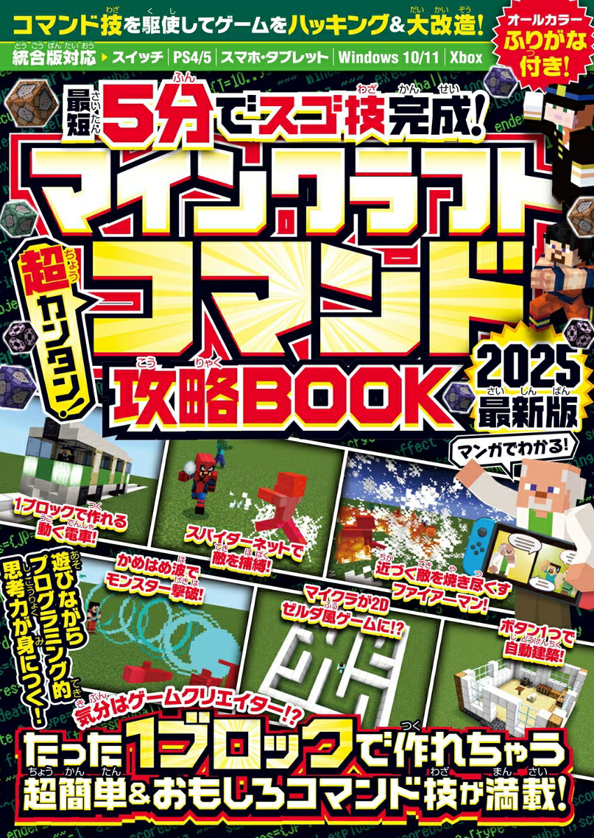 マインクラフトでもっともアツい最強テクニック「コマンド」技の中から、すぐに作れる短いコマンドテクニックを大量に紹介する一冊! 楽しいワザ、おもしろワザ、スゴワザ、便利ワザがよく分かる!!遊ぶだけでプログラミング的思考これ一冊でコマンドやコマンドブロックの使いこなしテクがしっかりわかる! もちろん本文にはふりがな付き!マイクラ世界の「神」となって、ゲームのルール自体を改造したり、ワールドを好きなように造り替えちゃおう!!●対応機種●スイッチ / PS4・5 / スマホ・タブレット / Windows 10・11 / Xbox●目次●[ 第1章 初級編 ] 1ブロックで作れるおもしろコマンドコマンド&コマンドブロックの使い方スパイダーネットで敵をからめとる!1ブロックで作れる動く電車動く電車に乗ってみよう!両手に武器を装備して二刀流!アイテムが減らない無限チェスト!テレポートマシンを作ろうボタンひとつで簡単パワーアップ!エンダードラゴンに乗ってみよう! ……ほか多数[ 第2章 応用編] コマンドブロックを連結して使ってみよう一撃必殺のかめはめ波で攻撃!月面ジャンプで宇宙旅行気分!マイクラの画面を2Dゼルダ風にする敵を燃やし尽くすファイアーマン!ドロップアイテムがTNTになって連鎖爆発!範囲内の敵を凍結する氷魔法炎の精霊を召喚する好きな動物やモンスターに変身!身体を風船化して飛ぶ!地震魔法で敵を一網打尽! ……ほか多数[ 第3章 基礎研究 ] コマンド活用マニュアルコマンドが使える環境を用意コマンドの用語を覚えようコマンドブロックの使い方[ 第4章 データベース集 ] コマンドID一覧エンティティID(友好的モブ)/エンティティID(敵対的モブ)/構造物ID/ステータス効果ID/エンチャント効果ID/ブロックID【 巻末特集 】読者のひろば&愛読者スーパーブレゼント