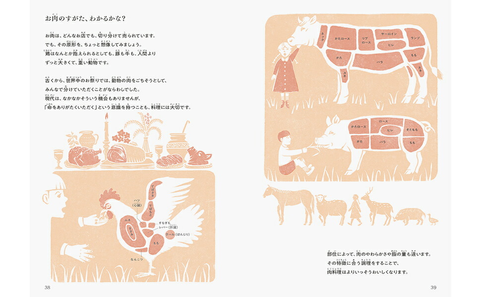 本当においしい!「食」を伝える簡単レシピ 原宿にrestaurant eatripを開き、世界一予約の取れないレストラン「シェ・パニース」で修業した経験もある野村友里が、大人も驚くおいしさのレシピを、子どもがつくれるようにアレンジ。唐揚げやチーズオムライス、ハンバーグや生姜焼きなどの基本の料理から、シェファーズパイ、お花しゅうまい、皮からつくるもちもち水餃子やラーメン、だしの取り方や手作りウスターソースまで、卵、肉、野菜、魚の料理を、約40レシピ紹介。レシピのほか、食の大切さや命をいただく大切さについても絵本仕立てで紹介し、「いつも何気なく口にしている食材はどこから来ているのか」といった食の本質について、三宅瑠人のイラストで、わかりやすくたのしく伝えます。コラム一例:・おいしいってなに?・卵は命をいただくこと・スーパーで売っているお肉の原型、想像できる?・野菜の土の下には何がいる?・季節によって、食べられる魚の種類は変わる・いろいろな姿に変化する、米と小麦野村友里による「食べることは生きること」というメッセージが込められた、ずっと大切にしたくなる、本質的な料理の本です。・人はみんな、「食べたもの」でできています・料理の道具を知ろう・材料のはかり方、よく使う調味料・さあ、準備をしよう・卵の話と10のレシピ・肉の話と10のレシピ・野菜の話と7のレシピ・魚の話と6のレシピ・米と小麦の話と8のレシピ・和風だしのレシピ・洋風の朝ごはん 和風の朝ごはん・いろいろな切り方 ピーラーやキッチンバサミも・大人もおいしいアレンジレシピ・おいしいってなに?