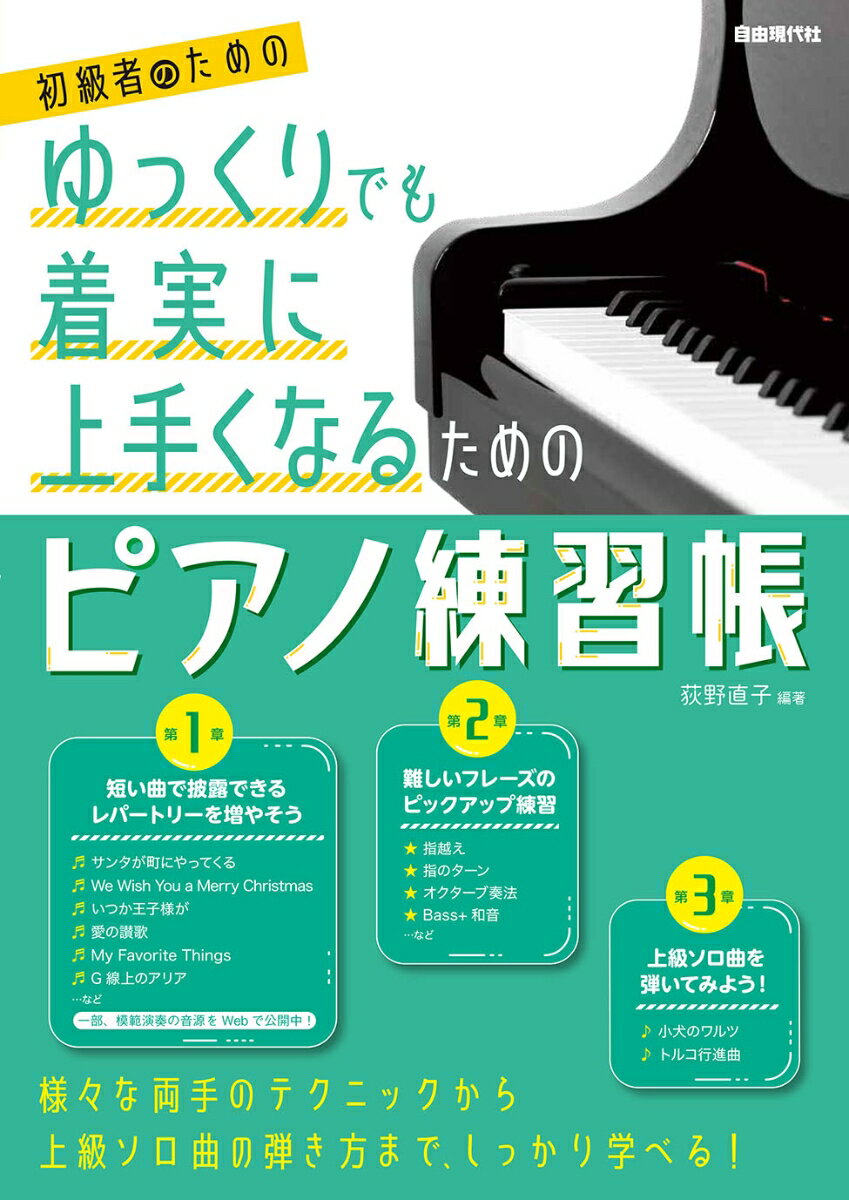 練習のモチベーションを保ちつつ、自分のペースで練習できるピアノ教本。【コンテンツ】●第1章 短い曲で披露できるレパートリーを増やそうSECTION1-1 バースディ・パーティで弾きたい! Happy Birthday to You 作曲:ミルドレッド・J・ヒル、パティ・スミス・ヒル Happy Birthday to You(完成形) 作曲:ミルドレッド・J・ヒル、パティ・スミス・ヒルSECTION1-2 クリスマスで弾きたい! きよしこの夜 作曲:フランツ・クサーヴァー・グルーバー きよしこの夜(完成形) 作曲:フランツ・クサーヴァー・グルーバー サンタが町にやってくる 作曲:フレッド・クーツ サンタが町にやってくる(完成形) 作曲:フレッド・クーツ We Wish You a Merry Christmas TRADITIONAL We Wish You a Merry Christmas(完成形) TRADITIONALSECTION1-3 オシャレに弾きたい! いつか王子様が 作曲:フランク・チャーチル いつか王子様が(完成形) 作曲:フランク・チャーチ 愛の讃歌 作曲:マルグリット・モノー 愛の讃歌(完成形) 作曲:マルグリット・モノー My Favorite Things 作曲:リチャード・ロジャース My Favorite Things(完成形) 作曲:リチャード・ロジャースSECTION1-4 お家でコンサート プレリュードOp.28-7 作曲:ショパン プレリュードOp.28-7(完成形) 作曲:ショパン G線上のアリア 作曲:J.S.バッハ G線上のアリア(完成形) 作曲:J.S.バッハ ジムノペディ 第1番 作曲:エリック・サティ ●第2章 難しいフレーズのピックアップ練習SECTION2-1 基本編 スケール、アルペジオでテクニックを身につけよう!SECTION2-2 基本編 指広げ・指縮めのトレーニングSECTION2-3 基本編 和音・転回形を練習しよう!SECTION2-4 応用編 「指のターン」で、なめらかに弾こう!SECTION2-5 応用編 同音連打で、素早いフレーズに対応しよう!SECTION2-6 応用編 オクターブ奏法で素敵なメロディを奏でよう!SECTION2-7 応用編 和音・転回形を実践しよう!●第3章 上級ソロ曲を弾いてみよう!SECTION3-1 小犬のワルツ 作曲:ショパンSECTION3-2 トルコ行進曲 作曲:モーツァルト