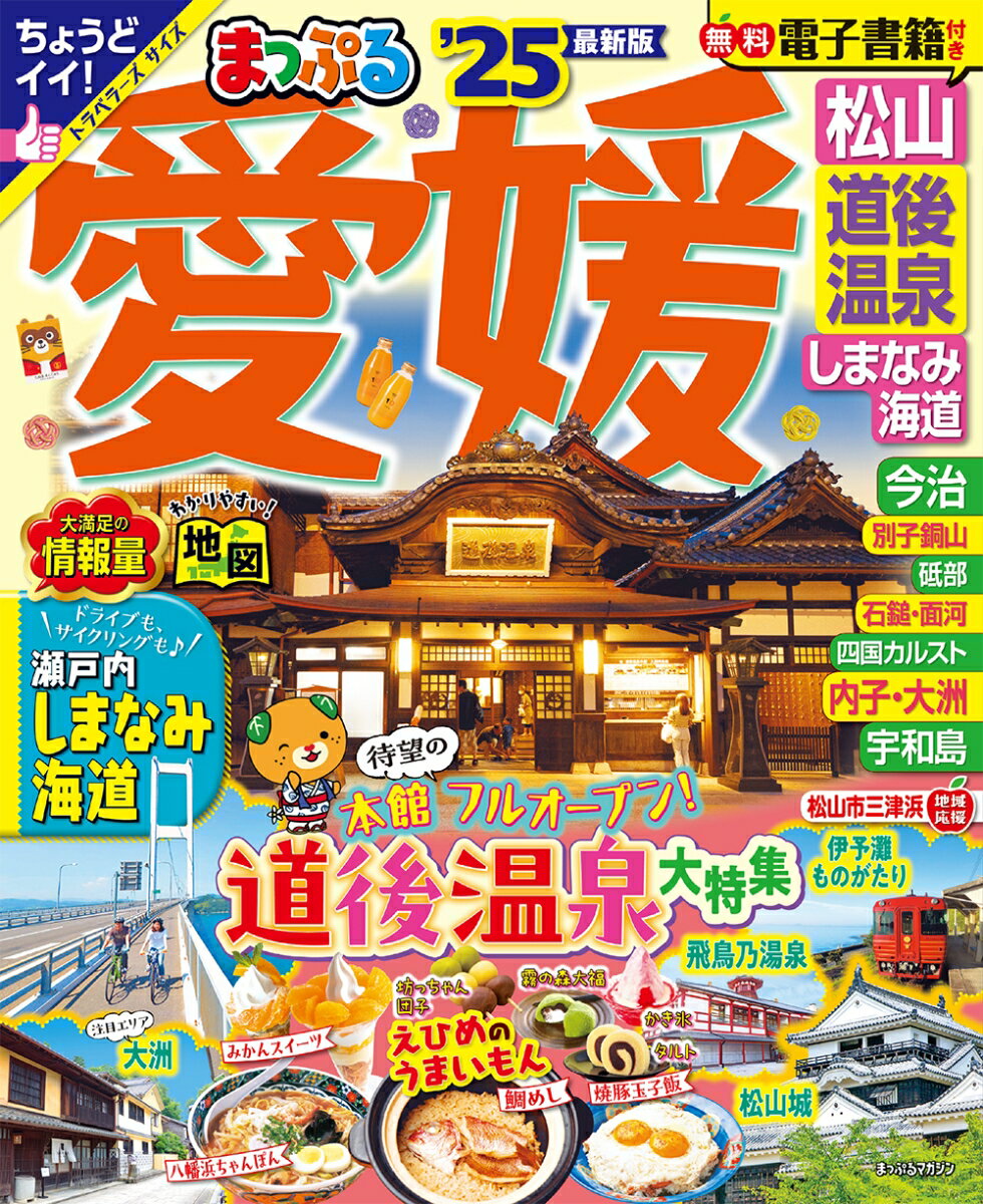 愛媛観光に欠かせない道後温泉本館が長年の修復期間を経て完全復活!松山を中心にしまなみ海道や、内子・大洲・宇和島への旅が注目を浴びています。ほかにも特産のみかんを使ったスイーツや、鯛めし、焼豚玉子飯、今治焼き鳥、八幡浜ちゃんぽんなどのご当地グルメはもちろん、瀬戸内海の島々、四国カルスト、石鎚・面河、佐田岬などの観光スポットへのモデルプランも充実、この一冊を手に、今が旬の愛媛旅へ!【注目1】道後温泉大特集道後温泉本館飛鳥の湯泉ハイカラ通り商店街そぞろ歩き道後ランチ【注目2】愛媛おみやげ大図鑑マストバイ湯の街みやげテーマ別みやげセレクション【注目3】エリア別特集松山・砥部 松山城大解剖/愛媛の郷土ごはんしまなみ海道・今治 よくばり1dayドライブ/シーサイドサイクリング●収録エリア道後温泉/松山・砥部 石鎚・面河・四国カルスト/しまなみ海道・今治 西条・新居浜/内子・大洲・宇和島 佐田岬シリーズ特長●国内・海外の「王道・定番」「最旬」旅行情報を紹介する雑誌スタイルの旅行ガイドシリーズ。軽くて持ち歩きにもちょうどイイ「トラベラーズサイズ」で、旅行前のプランニングはもちろん旅先でも大活躍!●国内版では、編集部が推す地域の見どころ・伝統的な取り組みを紹介する新コーナー「まっぷる地域応援プロジェクト」が、多様な旅のスタイルにもお応えします!●地図は、旅先での探しやすさ、見やすさを追求した専用の仕様●無料アプリ「まっぷるリンク」をダウンロードすることで、スマホで使えて便利な電子書籍も見られます(iPhone/Android対応)