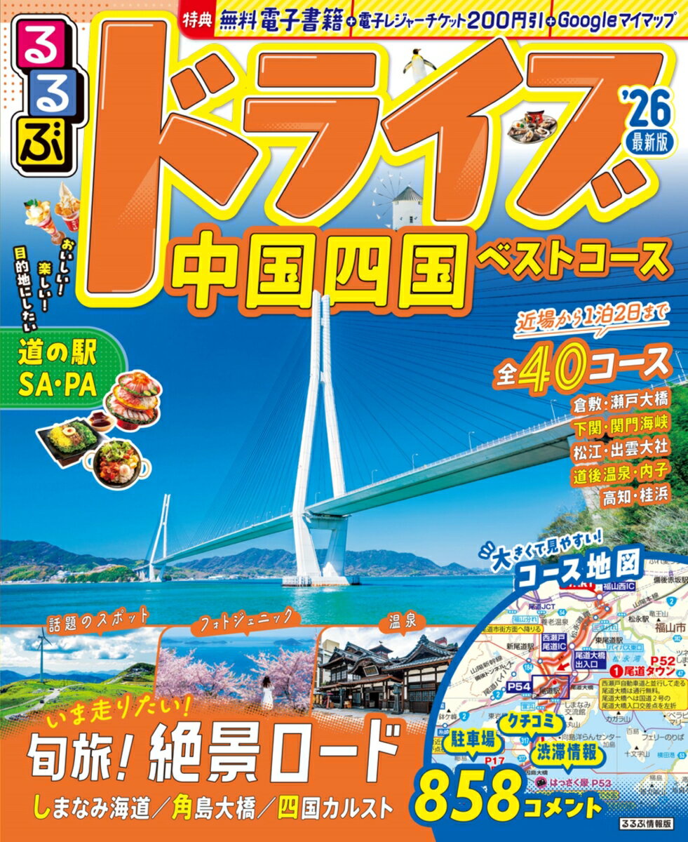 ◎スマホやタブレットで使える便利な電子書籍付き◎電子レジャーチケット「200円クーポン」でお得旅るるぶ編集部が実走取材!人気観光スポットから注目の新施設、グルメ情報までドライブにおすすめの40コースをご紹介。詳細地図や道路情報、便利なドライブコメントでクルマ旅を徹底ガイドします!<主な特集内容>【巻頭特集1】 車で行く!感動絶景・絶景ドライブロード(四国カルスト、しまなみ海道、角島大橋、UFOラインetc.)・フォトジェニックな絶景(父母ヶ浜、元乃隅神社、にこ淵etc.)・お花の絶景(とっとり花回廊、北川村「モネの庭」マルモッタン、紫雲出山etc.)【巻頭特集2】 旬旅ベストドライブ・山陰屈指のパワースポットへ!1泊2日出雲〜松江〜美保関コース・道後の名湯としまなみの絶景!1Day道後温泉〜今治コース・やなせたかしさんの故郷へ!1Day香美〜安芸コース・瀬戸内の人気スポットと島旅!1泊2日倉敷〜高松〜小豆島コース◆中国四国ドライブNEWS&TOPICS◆+aが楽しみな 道の駅◆高速道路別・最新SA・PA人気&話題グルメ【ドライブコース 全40コース】<山陽>・倉敷〜瀬戸大橋・呉〜音戸の瀬戸・広島〜宮島〜岩国・下関〜関門海峡 ほか<山陰>・鳥取砂丘〜倉吉・境港〜米子〜安来・萩〜秋吉台・角島〜長門 ほか<四国>・鳴門〜徳島・祖谷渓〜大歩危・四万十川・足摺岬 ほか◆中国四国広域ドライブMAP/高速道路MAP【掲載エリア】 倉敷、岡山、しまなみ海道、呉、広島、宮島、下関、関門海峡、萩、長門、鳥取砂丘、大山、境港、松江、出雲、石見銀山、鳴門、徳島、祖谷渓、小豆島、琴平、高松、道後、松山、高知、桂浜、四万十川、足摺岬※200円クーポンの利用期間は図書の販売終了まで●「るるぶ」は、「みる」「食べる」「遊ぶ」を中心におすすめエリアやスポットを徹底紹介した旅行ガイドブックです。国内・海外あわせて約200のラインナップを展開、2023年でブランド誕生50周年を迎えました!「るるぶ」の特徴はこちら・写真が多くてわかりやすい!・最新情報がたっぷり!・見やすい地図もついてくる!初めて訪れる方からリピーターまで、幅広い方々により旅行を楽しんでいただけるガイドブックです。