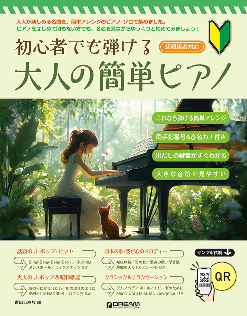 大人が楽しめる名曲を、超初級者向けピアノ・ソロ・アレンジで集めました。見やすく大きな譜面と、音名ふりがな・指番号付きで楽しめるピアノ・ソロ曲集です。最新のJ-POPから定番クラシックまで、ピアノをはじめて間もない方、まだ五線譜に慣れていない方でも、音名を見ながらゆっくりと始めてみましょう![話題のJ-ポップ・ヒット]Bling-Bang-Bang-Born〔Creepy Nuts〕US〔milet〕Burning〔羊文学〕ダンスホール〔Mrs. GREEN APPLE〕ミックスナッツ〔Official髭男dism〕新しい恋人達に〔back number〕ファタールーFatal〔GEMN〕桜日和とタイムマシン with 初音ミク〔Ado〕[大人のJ-ポップ&昭和歌謡]あの日にかえりたい〔荒井由実〕恋人よ〔五輪真弓〕少年時代〔井上陽水〕なごり雪〔イルカ〕恋の予感〔安全地帯〕愛燦燦〔美空ひばり〕いい日旅立ち〔山口百恵〕川の流れのように〔美空ひばり〕SWEET MEMORIES〔松田聖子〕時の流れに身をまかせ〔テレサ・テン〕いとしのエリー〔サザンオールスターズ〕[日本の歌・我が心のメロディー]知床旅情花故郷の人々(スワニー河)里の秋浜辺の歌早春賦故郷ーふるさとー宵待草[クラシック&リラクゼーション]アメイジング・グレイスジムノペディ 第1番エリーゼのために主よ人の望みの喜びよトルコ行進曲(ベートーベン)パッヘルベルのカノンMerry Christmas Mr. Lawrence〔坂本龍一「戦場のメリークリスマス」より〕小さな旅 〜光と風の四季〜[話題のJ-ポップ・ヒット]Bling-Bang-Bang-Born〔Creepy Nuts〕US〔milet〕Burning〔羊文学〕ダンスホール〔Mrs. GREEN APPLE〕ミックスナッツ〔Official髭男dism〕新しい恋人達に〔back number〕ファタールーFatal〔GEMN〕桜日和とタイムマシン with 初音ミク〔Ado〕[大人のJ-ポップ&昭和歌謡]あの日にかえりたい〔荒井由実〕恋人よ〔五輪真弓〕少年時代〔井上陽水〕なごり雪〔イルカ〕恋の予感〔安全地帯〕愛燦燦〔美空ひばり〕いい日旅立ち〔山口百恵〕川の流れのように〔美空ひばり〕SWEET MEMORIES〔松田聖子〕時の流れに身をまかせ〔テレサ・テン〕いとしのエリー〔サザンオールスターズ〕[日本の歌・我が心のメロディー]知床旅情花故郷の人々(スワニー河)里の秋浜辺の歌早春賦故郷ーふるさとー宵待草[クラシック&リラクゼーション]アメイジング・グレイスジムノペディ 第1番エリーゼのために主よ人の望みの喜びよトルコ行進曲(ベートーベン)パッヘルベルのカノンMerry Christmas Mr. Lawrence〔坂本龍一「戦場のメリークリスマス」より〕小さな旅 〜光と風の四季〜