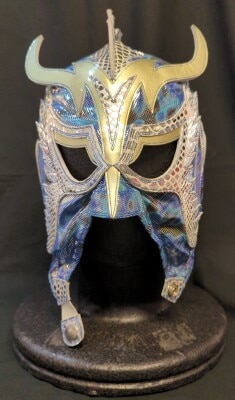 プロレスマスク ミゲルアンヘル製【ウルティモ・ドラゴン(青特殊柄生地×銀・白特殊柄入りフチ)】 タグなし 本人使用 サイン入り 着用写真付き