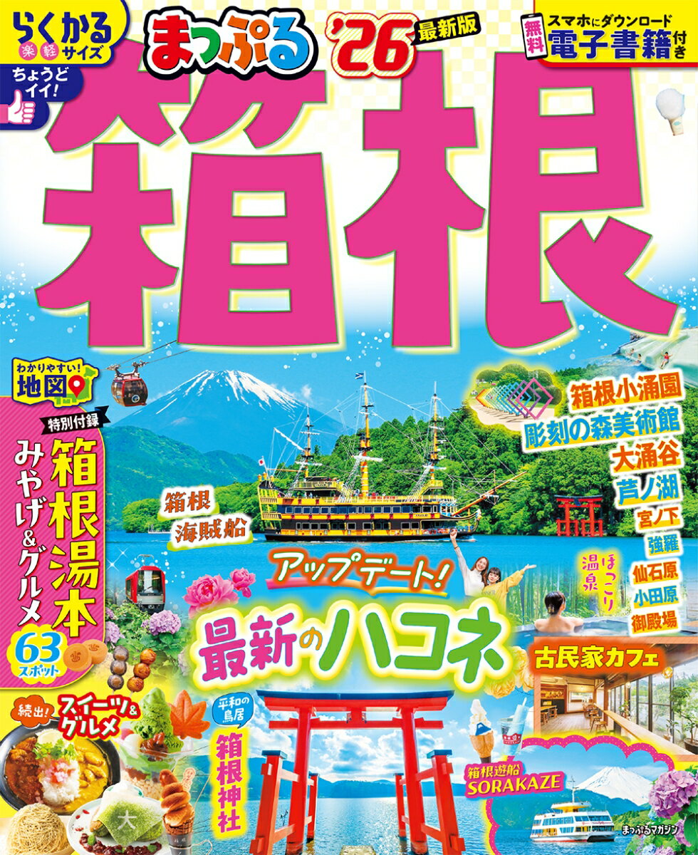 箱根の最新情報が詰まった一冊。登山電車やロープウェイ、海賊船など楽しさ満点の乗り物で周遊したり、ランチには話題のグルメを堪能したり、森に囲まれたミュージアムでのんびりアート三昧もオススメ。巻頭付録「箱根湯本のグルメ&おみやげガイド」はストリートを見渡せる、広げて使える便利なショップガイド。【注目1】箱根湯本グルメ&おみやげガイド(付録)箱根湯本ストリートガイド箱根湯本駅ナカ案内【注目2】箱根トレンディ 最新話題はコレレトロカフェが続々と誕生次世代映えスイーツをハント【注目3】旅のトリセツ Part4温泉+αを楽しむ ハコネ旅プランプラン1絶景&神社&クルーズプラン2美術館&スパ&レトロさんぽプラン3絶景温泉&ガーデン【注目4】エリア別特集宮ノ下・小涌谷 スタルジック 宮ノ下さんぽ/富士屋ホテル大涌谷 大涌谷でパワーチャージ小田原 ミナカ小田原/小田原漁港●収録エリア箱根町/小田原市/御殿場市/三島市/箱根湯本/宮ノ下/小涌谷/強羅/大涌谷/仙石原/芦ノ湖/箱根旧街道シリーズ特長●国内・海外の「王道・定番」「最旬」旅行情報を紹介する雑誌スタイルの旅行ガイドシリーズ。軽くて持ち歩きにもちょうどイイ「トラベラーズサイズ」で、旅行前のプランニングはもちろん旅先でも大活躍!●国内版では、編集部が推す地域の見どころ・伝統的な取り組みを紹介する新コーナー「まっぷる地域応援プロジェクト」が、多様な旅のスタイルにもお応えします!●地図は、旅先での探しやすさ、見やすさを追求した専用の仕様●無料アプリ「まっぷるリンク」をダウンロードすることで、スマホで使えて便利な電子書籍も見られます(iPhone/Android対応)