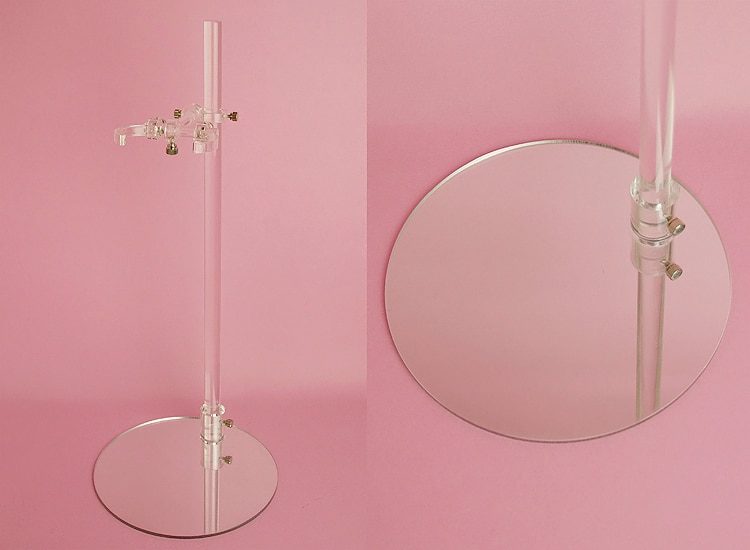 | ■ANGEL PHILIAドールのポージングを最大限に楽しむために開発された日本製オリジナルディスプレイスタンドです。透明度の高い高級アクリル材を使用しておりますので、目立たなく綺麗ですっきりとしたディスプレイが楽しめます。 アクリルスタンドLは丸棒の長さを30mm延長し、靴底やヒールの高い靴を履いても対応できるように改良致しました。 更に丸ベース(台座)の直径も約30mm増やしたことで、より良い安定感を実現しました。 ■ドールの高さや形状に合わせ、アタッチメント部を上下に調整できます。 ■アタッチメント部を前後に動かせるオリジナル機構により、S字ポーズなど前後にスペースの要るポーズに最適です。 また、この機構によりスタンド(丸棒/支柱)と衣装やウィッグの干渉も避けられるので、自然なディスプレイが楽しめます。 ■アタッチメント部のドールを挟み込み固定する左右のパーツは、それぞれが可動し取り出しも可能なので、ボディの形状や衣装のボリュームによって自由に調整できます。 材 質:アクリル製 サイズ:スタンド(支柱)/長さ約430mm :丸ベース/直径約170mm ~使用上のご注意点~ □全高約40~50cmのソフビ製ドールに対応したスタンドです。キャスト製などの大型ドールに使用した場合、重さなどでスタンドが破損し、ドールが倒れ破損する恐れがあります。 □アクリル(及びミラー部)は非常に傷つきやすいのでご注意ください。 □各可動調整部のネジ留めは、無理にきつく締めるとアクリルが割れて破損しますので、ネジを締める際はご注意ください。 □落としたり、無理な力を加えると割れたりヒビが入る場合があります。 |