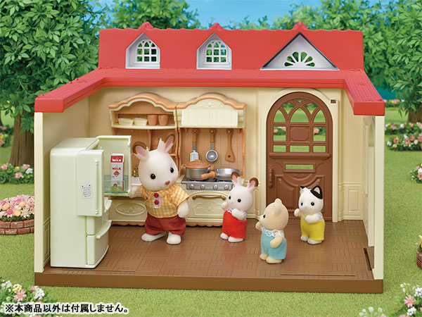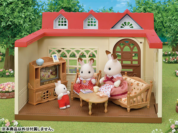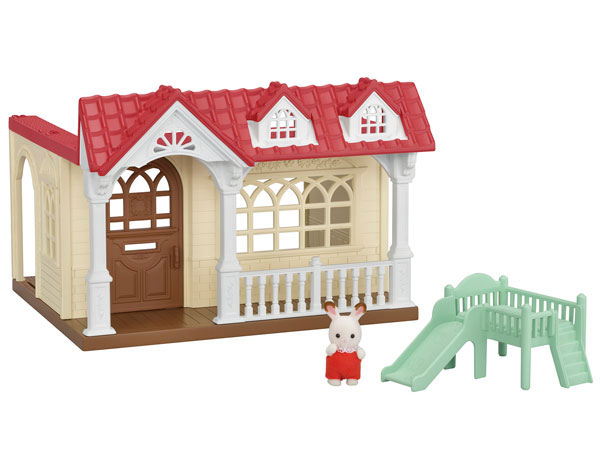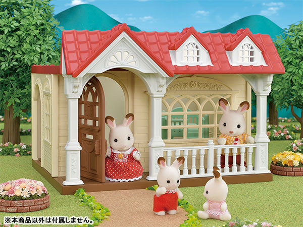 玄関のテラスがすてきな、赤い屋根の1階建てのお家です。 ショコラウサギの赤ちゃんと、赤ちゃん用の家具がセットになっているので、このセットだけですぐに遊べます。