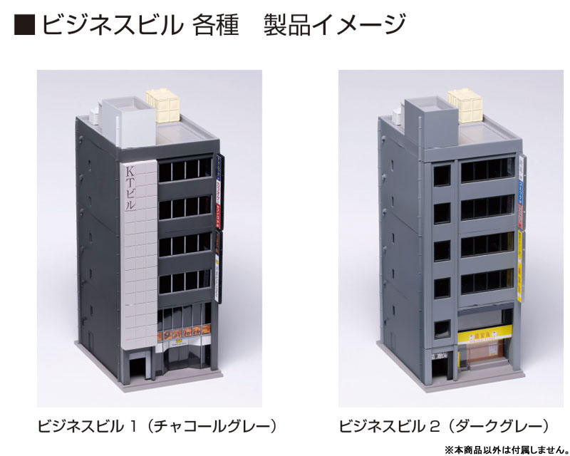 Nゲージ・塗装済完成品 【サイズ】ベース:W62mm×D81mm、全高:162mm 【セット内容一覧】 ビジネスビル1(チャコールグレー) シール 看板2種×1