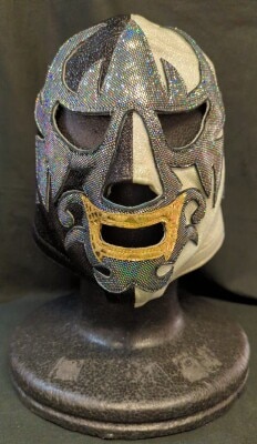 プロレスマスク アランレイエス製【ストゥーカJr.(銀ラメ・水色ラメ生地×赤・黒・銅ホロフチ)】 タグ付き 本人使用 サイン入り