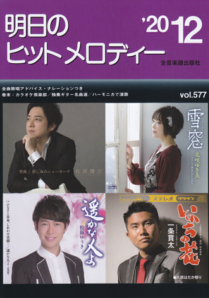 1:◆【新曲】 2:あゝ染みるぜ 3:あなたの水中花 4:いのちの花 5:男の昭和挽歌 6:男の花 7:思い出に抱かれて 8:俺の人生 9:楓 10:小手毬草 11:幸せはホラ・・・ 12:遥かな人よ 13:星空のツイスト 14:まよい川 15:雪窓 16:愛遥かに 17:あの頃も今も〜花の24年組〜 18:君と見てるから 19:湘南レイニーデイ 20:雪風 21:◆【B面コーナー】 22:月酒場 23:東京 24:浪花の花形 25:◆【ハーモニカで演歌】 <数字譜> 26:雨の香林坊 27:◆【独奏ギター名曲選】 <簡単に弾けるタブ譜付き> 28:伊吹おろし 29:◆【カラオケ倶楽部】 <歌い方解説・音楽マメ知識付き> 30:あーちゃんの唄 31:大阪なさけ川 32:面影しぐれ 33:俺と生きような 34:呉れない情話 35:人生は