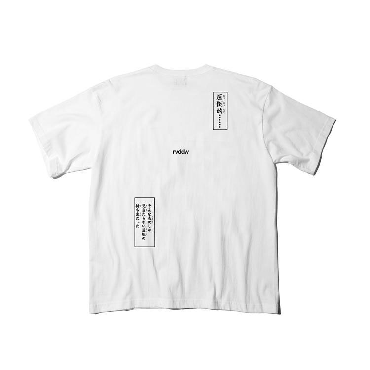 花山薫×rvddw「圧倒的・・・・・・」TEE 花山の圧倒的なルックをメインに特徴的な眉毛、傷跡とシンクロしたレタードが印象的なフロントと抑えめながら奥行きを感じるストーリーテリングなバックの組み合わせが非常にクールなデザインです。