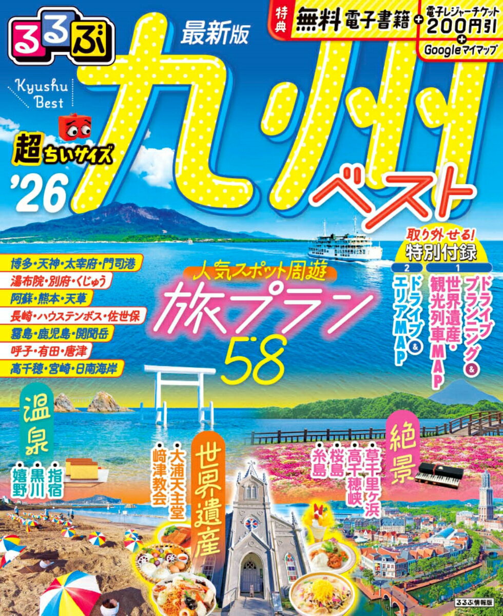 ◎スマホやタブレットで使える便利な電子書籍付き◎電子レジャーチケット「200円クーポン」でお得旅◎大きくて見やすいサイズ(通常版/25.7×21cm)と、持ち運びに便利な「超ちいサイズ」(18×14.7cm)の2つのサイズ展開!こちらは「超ちいサイズ」の商品ページです。エリア別に人気観光を巡れる58の旅プランを提案!地図付きでプランの流れが把握しやすい!ご当地グルメや宿など+αの情報も満載。<主な特集内容>◆巻頭特集最旬ニュース&トピックス/おでかけカレンダー/2泊3日&1泊2日 九州ベストな旅プラン◆エリア特集【福岡】博多駅周辺/ 天神/川端/福岡城跡/ベイエリア/海の中道・志賀島/宗像大社/福津/門司港/太宰府/柳川/糸島旅プラン+α…博多ラーメン/もつ鍋/水炊き/屋台/辛子明太子【佐賀】呼子/唐津/有田/嬉野温泉/武雄温泉【長崎】長崎タウン/出島/浦上/軍艦島/ハウステンボス/佐世保〜九十九島/波佐見/平戸/島原/雲仙旅プラン+α…ちゃんぽん/皿うどん/トルコライス/魚介料理/卓袱料理/カステラ/長崎夜景/佐世保バーガー/雲仙温泉の宿【大分】鉄輪/明礬温泉/亀川温泉/別府駅周辺/湯布院/くじゅう/竹田/宇佐/豊後高田/国東半島/臼杵/耶馬渓/日田旅プラン+α…別府の宿/とり天/別府冷麺/関サバ・関アジ/豊後牛/だんご汁/地物ランチ/湯布院の宿【熊本】熊本タウン/阿蘇/黒川温泉/人吉/天草旅プラン+α…熊本ラーメン/馬肉料理/阿蘇ごはん/黒川温泉の宿【鹿児島】城山周辺/天文館/鹿児島中央駅/仙巌園周辺/桜島/指宿/開聞岳/知覧/霧島旅プラン+α…黒豚/鹿児島ラーメン/薩摩料理/白熊/霧島の宿【宮崎】日南海岸/高千穂/宮崎タウン/飫肥旅プラン+α…高千穂人気ランチスポット/チキン南蛮/地鶏炭火焼/宮崎牛/冷や汁/肉巻きおにぎり/フルーツパフェ◆特別2大付録付き【1】九州ドライブプランニングMAP&世界遺産・観光列車MAP【2】ドライブ&エリアMAP※200円クーポンの利用期間は図書の販売終了まで●「るるぶ」は、「みる」「食べる」「遊ぶ」を中心におすすめエリアやスポットを徹底紹介した旅行ガイドブックです。