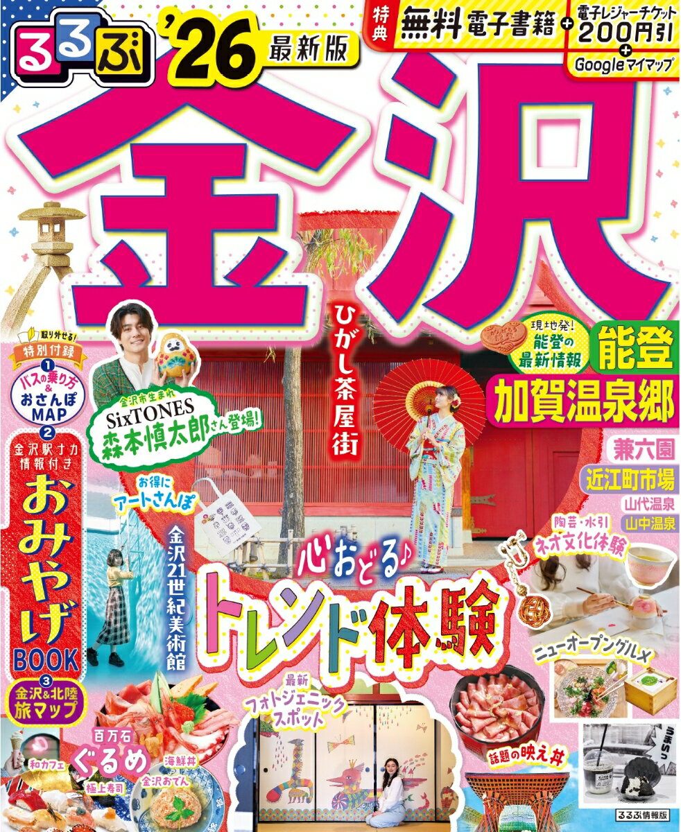 ◎スマホやタブレットで使える便利な電子書籍付き◎電子レジャーチケット「200円クーポン」でお得旅◎大きくて見やすいサイズ(通常版/25.7×21cm)と、持ち運びに便利な「超ちいサイズ」(18×14.7cm)の2つのサイズ展開!こちらは通常版の商品ページです。ひがし茶屋街、金沢21世紀美術館、兼六園など定番のスポットから、たくさんのトレンド情報が満載。さらにSixTONES・森本慎太郎さんが登場で、充実の1冊です!<主な特集内容>【巻頭スペシャルインタビュー】 石川県金沢市生まれ!SixTONES 森本慎太郎さんも行きたい!金沢・森本さん流・金沢の過ごし方・金沢周辺 観光スポットについて・金沢のごはんは日本一おいしい!・SixTONESのメンバーと金沢に行くなら……【巻頭特集1】 事前にチェック!早わかり・金沢・能登・加賀温泉郷ってこんなところ・映えるスポットを網羅!1泊2日金沢新定番プラン【巻頭特集2】 心おどる最旬!トレンド体験8・金沢で最注目のニューオープングルメ店へ・フォトジェニックスポットで映えショットを撮影・気軽に楽しむ伝統工芸体験・SNSでも話題 映え丼をねらいうち!・朝から豪華に金沢グルメ ホテルモーニングで優雅なひと時を・お得なチケットで文化活動!金沢21世紀美術館とあわせて行きたい個性派ミュージアム・音楽スポット、バー、夜スイーツも!金沢の夜をエンジョイ・金沢で能登を感じよう!【巻頭特集3】 百万石ぐるめ・おみちょでチョイ食べおやつ・近江町市場の海鮮丼・回転寿司・極上寿司・王道ソウルフード・金沢おでん・加賀料理・金沢のパン・海鮮居酒屋・映えスイーツ・老舗プロデュースの和カフェ【エリア特集】・ひがし茶屋街・金沢21世紀美術館・兼六園、金沢城公園・能登・加賀温泉郷etc.上記のほか、各エリアの名物グルメ、注目宿情報も満載です。【特別付録1】 大判地図 金沢バスのかしこい乗り方ガイド&金沢おさんぽマップ【特別付録2】 金沢おみやげBOOK【特別付録3】金沢&北陸旅MAP【掲載エリア】 石川、金沢、ひがし茶屋街、金沢21世紀美術館、兼六園、主計町茶屋街、長町武家屋敷跡、にし茶屋街、寺町寺院群、せせらぎ通り、香林坊・片町、大野・金石、能登、加賀温泉郷、山代温泉、山中温泉、小松、片山津温泉※200円クーポンの利用期間は図書の販売終了まで●「るるぶ」は「みる」「食べる」「遊ぶ」を中心におすすめエリアやスポットを徹底紹介した旅行ガイドブックです。
