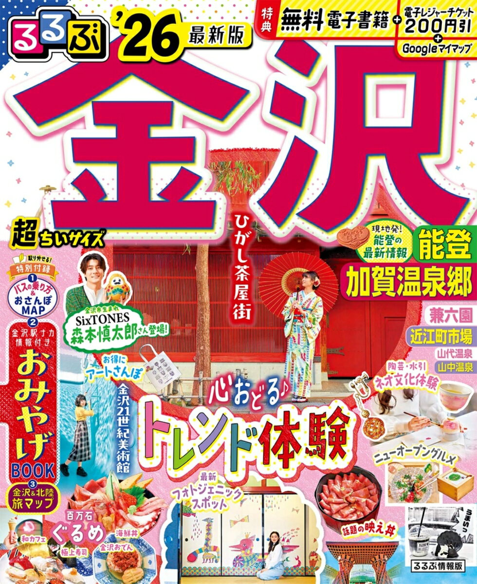 ◎スマホやタブレットで使える便利な電子書籍付き◎電子レジャーチケット「200円クーポン」でお得旅◎大きくて見やすいサイズ(通常版/25.7×21cm)と、持ち運びに便利な「超ちいサイズ」(18×14.7cm)の2つのサイズ展開!こちらは「超ちいサイズ」の商品ページです。ひがし茶屋街、金沢21世紀美術館、兼六園など定番のスポットから、たくさんのトレンド情報が満載。さらにSixTONES・森本慎太郎さんが登場で、充実の1冊です!<主な特集内容>【巻頭スペシャルインタビュー】 石川県金沢市生まれ!SixTONES 森本慎太郎さんも行きたい!金沢・森本さん流・金沢の過ごし方・金沢周辺 観光スポットについて・金沢のごはんは日本一おいしい!・SixTONESのメンバーと金沢に行くなら……【巻頭特集1】 事前にチェック!早わかり・金沢・能登・加賀温泉郷ってこんなところ・映えるスポットを網羅!1泊2日金沢新定番プラン【巻頭特集2】 心おどる最旬!トレンド体験8・金沢で最注目のニューオープングルメ店へ・フォトジェニックスポットで映えショットを撮影・気軽に楽しむ伝統工芸体験・SNSでも話題 映え丼をねらいうち!・朝から豪華に金沢グルメ ホテルモーニングで優雅なひと時を・お得なチケットで文化活動!金沢21世紀美術館とあわせて行きたい個性派ミュージアム・音楽スポット、バー、夜スイーツも!金沢の夜をエンジョイ・金沢で能登を感じよう!【巻頭特集3】 百万石ぐるめ・おみちょでチョイ食べおやつ・近江町市場の海鮮丼・回転寿司・極上寿司・王道ソウルフード・金沢おでん・加賀料理・金沢のパン・海鮮居酒屋・映えスイーツ・老舗プロデュースの和カフェ【エリア特集】・ひがし茶屋街・金沢21世紀美術館・兼六園、金沢城公園・能登・加賀温泉郷etc.上記のほか、各エリアの名物グルメ、注目宿情報も満載です。【特別付録1】 大判地図 金沢バスのかしこい乗り方ガイド&金沢おさんぽマップ【特別付録2】 金沢おみやげBOOK【特別付録3】金沢&北陸旅MAP【掲載エリア】 石川、金沢、ひがし茶屋街、金沢21世紀美術館、兼六園、主計町茶屋街、長町武家屋敷跡、にし茶屋街、寺町寺院群、せせらぎ通り、香林坊・片町、大野・金石、能登、加賀温泉郷、山代温泉、山中温泉、小松、片山津温泉※200円クーポンの利用期間は図書の販売終了まで●「るるぶ」は「みる」「食べる」「遊ぶ」を中心におすすめエリアやスポットを徹底紹介した旅行ガイドブックです。