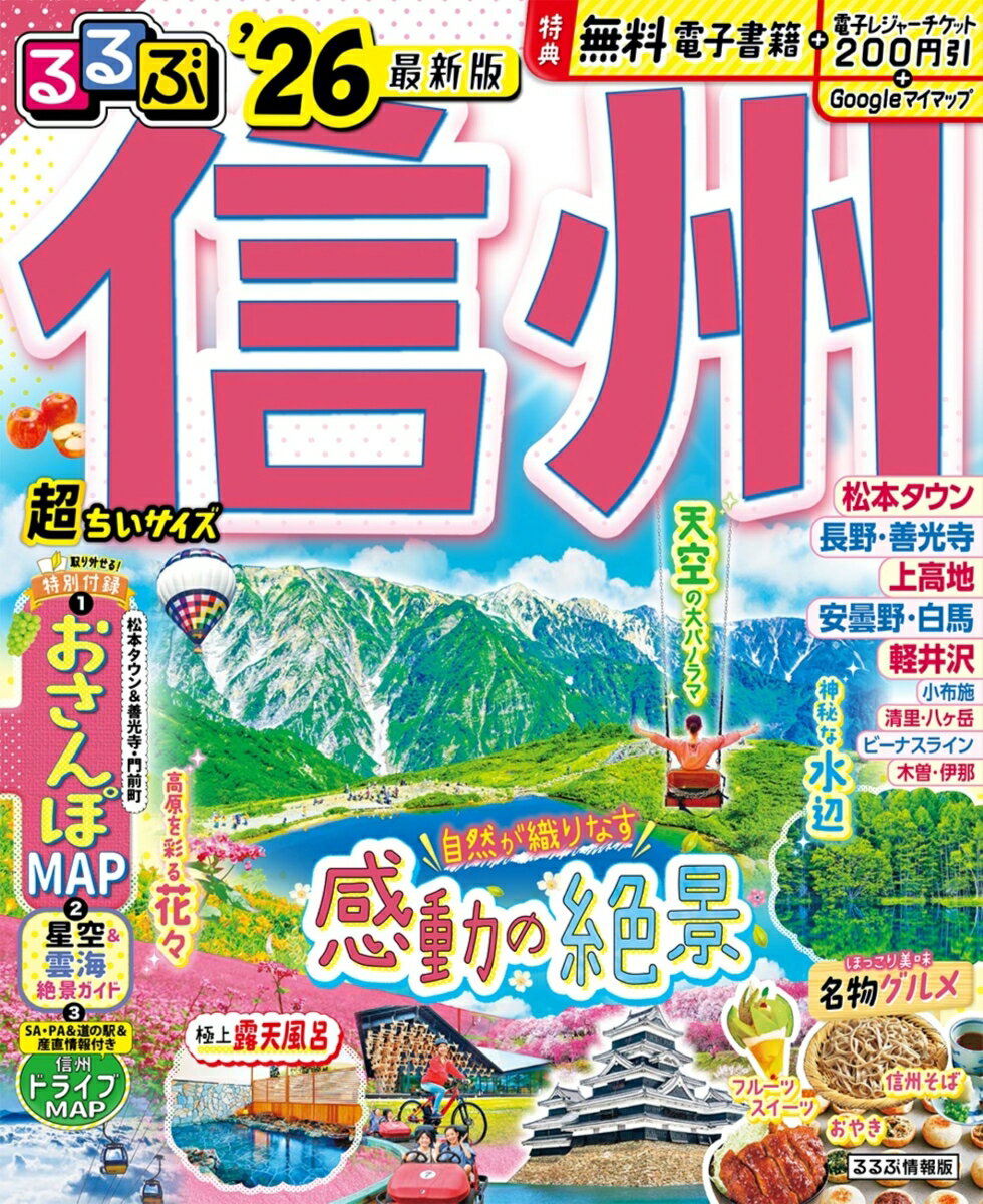 ◎スマホやタブレットで使える便利な電子書籍付き◎電子レジャーチケット「200円クーポン」でお得旅◎大きくて見やすいサイズ(通常版/25.7×21cm)と、持ち運びに便利な「超ちいサイズ」(18×14.7cm)の2つのサイズ展開!こちらは「超ちいサイズ」の商品ページです。信州を訪れたら絶対見たい星空や雲海、テラスの絶景やハイキング、街歩き情報が満載。各エリアのモデルプランやご当地グルメ、フルーツたっぷりのスイーツなど、グルメ情報も充実の大満足な1冊です!<主な特集内容>【巻頭特集1】 キーワード別で楽しむ 感動絶景・空、水、花【巻頭特集2】 信州グルメ&みやげ・こだわりの名店そば ・名物そばと郷土料理・フルーツスイーツ ・信州みやげ【エリア特集】◆松本・安曇野・白馬・国宝 松本城・松本グルメ・大王わさび農場・安曇野サイクリング・白馬で遊ぼう!アウトドア体験◆上高地・乗鞍・白骨温泉・大正池〜河童橋〜明神ハイキング・リゾートホテルのレストラン&カフェ・乗鞍・畳平お花畑ハイキング◆長野・戸隠・小布施・志賀高原・善光寺・パワスポ戸隠神社・戸隠そばの名店へ・小布施ぶらっと街歩き・志賀高原自然探求コースハイキング・野沢温泉湯のまちさんぽ◆軽井沢・上田・別所温泉・ハルニレテラス・軽井沢絶品ランチ&テラス自慢のカフェ・旧軽井沢銀座通りさんぽ・別所温泉ご利益さんぽ・上田城◆清里・諏訪・蓼科・ビーナスライン・清泉寮、星野リゾート リゾナーレ八ヶ岳・ビーナスライン高原ドライブ・美ヶ原高原ハイキング・1day諏訪湖遊び◆木曽・伊那・高遠・阿智村・奈良井宿&妻籠宿&馬籠宿 3大宿場町さんぽ・高遠さくら祭りetc.上記のほか、各エリアの名物グルメ、注目宿情報も満載です。【特別付録1】大判MAP【特別付録2】星空&雲海トリップBOOK【特別付録3】信州ドライブMAP【掲載エリア】 長野、松本、美ヶ原、安曇野、大町、白馬、上高地、乗鞍、奥飛騨温泉郷、白骨温泉、戸隠、小布施、志賀高原、湯田中渋温泉郷、軽井沢、小諸、別所温泉、上田、清里、小淵沢、蓼科、諏訪、木曽、阿智村、伊那・高遠※200円クーポンの利用期間は図書の販売終了まで●「るるぶ」は、「みる」「食べる」「遊ぶ」を中心におすすめエリアやスポットを徹底紹介した旅行ガイドブックです。