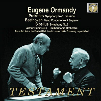 世界初出 1963年ライヴベートーヴェン:皇帝、シベリウス:交響曲第2番、他ルービンシュタイン、オーマンディ&フィルハーモニア管弦楽団ビートルズが大ブレイクしプロヒューモ事件がスキャンダラスに報じられたロンドンをさらに過熱させた、ルービンシュタインとオーマンディという二大巨匠の共演!アルトゥール・ルービンシュタインとユージン・オーマンディは(特にアメリカでの)十二分なキャリアで世界的称賛を得た巨匠ではありましたが、それぞれのレコード会社との契約上の問題で、レコーディングでの共演はありませんでした。そのため、1963年のロンドンでの共演は、千載一遇のチャンスとしてロンドンのファンを熱狂させました。1963年のロンドンは、ビートルズの大ブレイクやプロヒューモ事件などで、世界中から注目されており、街の空気自体がどこか高揚していたのですが、そんな中での二大巨匠の共演はそうした空気感をさらにヒートアップさせたと言われています。 当然、チケットは完売、期待の高まりは尋常ではありませんでした。しかしながら、当日、期待を裏切るどころか上回る究極の演奏が成されたのです。『古典交響曲』では、たいがいの演奏には驚かないロンドンの聴衆を震撼させるほどの速いテンポが採用され、「オーマンディはロンドンのオケを試しているのか?」とすら思わせるものでした。『皇帝』では、76歳とは思えないルービンシュタインのピアニズムが冴えわたり、オリンポスの神々のごとく堂々とした演奏を聴くことができます。 シベリウスの交響曲においては、オーマンディ独自の解釈で木管とトランペットの編成が倍になっています。その結果、スカンジナビア的な淡泊さというよりはロシア的な重厚なサウンドで、壮大かつ豊穣なドラマが表現されています。(TESTAMENT)【収録情報】Disc1 [51:57]● プロコフィエフ:交響曲第1番ニ長調 op.25『古典』● ベートーヴェン:ピアノ協奏曲第5番変ホ長調 op.73『皇帝』Disc2 [43:41]● シベリウス:交響曲第2番ニ長調 op.43 アルトゥール・ルービンシュタイン(ピアノ) フィルハーモニア管弦楽団 ユージン・オーマンディ(指揮) 録音時期:1963年6月 録音場所:ロンドン、ロイヤル・フェスティヴァル・ホール 録音方式:モノラル(ライヴ)Powered by HMV
