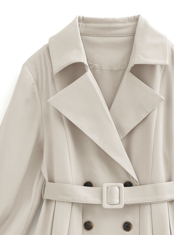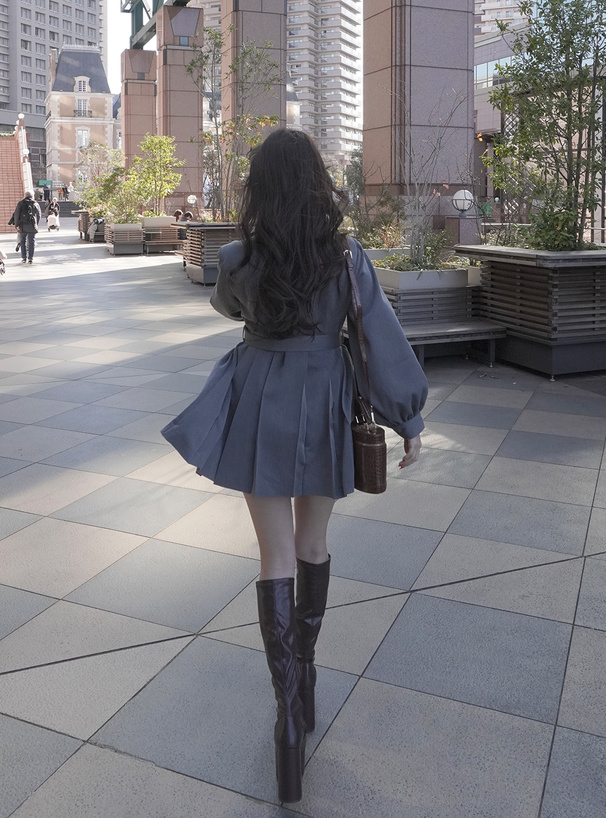 共布ベルト付きでウエストをマークし、女性らしいラインが際立つ。