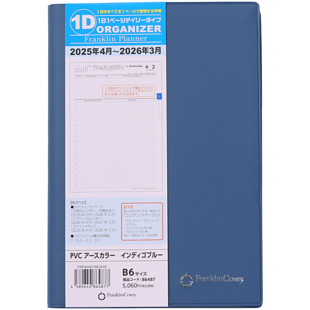 2025年4月〜2026年3月までの4月始まり商品。 全ラインナップ分冊版が好評な1日1ページ オーガナイザー。A5サイズとB6サイズをご用意しています。 カバー付商品は取り外し可能です。<特長>1.コンテンツ部分「プランナーガイド&フォーム」と「スケジュールページ」の2分冊版。コンテンツ部分は自宅やオフィスに置いて軽く持ち歩くことも可能です。2.一週間が8ページ構成。土曜日と日曜日のデイリーページを横並びにすることで、週末のスケジュールが立てやすくなりました。ウィークリー・プランニング(一週間コンパス)とウィークリー・タスクページが週の初めにレイアウトされているので一週間が始まる前に週の計画を立てるのに便利です。一週間コンパスは、ページ内に集約しました。3.デイリーページ内デイリータスク・リスト欄が3分割。「QⅡActivities」(第Ⅱ領域活動を計画)を記入する欄と、デイリータスク・リスト欄が2分割。タスク・リスト欄を2分割にすることでビジネスとプライベートに分けたり、色々な使い方が可能。4.デイリーページの時間軸は7時〜22時。5.月間カレンダーは月曜日始まりです。●日付期間(掲載期間):月間:2025 年3 月〜2026 年3 月 デイリー:2025 年4 月〜2026 年3 月●罫内容:月間:ブロックタイプ デイリー:1日1ページタイプ●記入欄:月間予定表ブロック式 デイリー予定表:1日1ページ 月曜始まり●サイズ(判型):B6●寸法:タテ192×ヨコ134×厚み23mm●色:インディゴブルー●表紙:PVC●中紙:トモエリバーS●ページ数:本冊:464ページ 別冊:80ページ