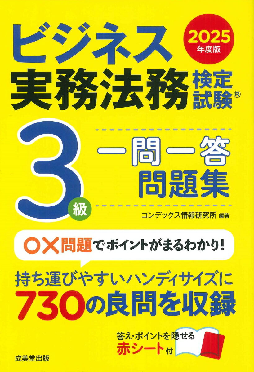 出題が予想される問題に的をしぼり、正確な正誤を判断する力をつけるための一問一答形式の問題集。各章の終わりには、様々な出題形式のパターンを再現した予想問題を掲載。持ち運びやすいハンディサイズに730の良問を収録。公式テキストの内容を、問題を解くことで学べる。答え、ポイントを隠せる赤シート付き。 ◇ 試験ガイダンス【1章】 ビジネスにおけるリスクと法律 o 覚えておきたい重要ポイント LESSON: ビジネス環境の変化に対する法律の影響 LESSON: ビジネス実務法務とコンプライアンス LESSON: ビジネスとリスク LESSON: ビジネス実務法務における契約の重要性 LESSON: 私法の基本原理 ほか ■ チャレンジ【2章】 企業取引の法務 o 覚えておきたい重要ポイント LESSON: 契約とは LESSON: 契約の種類と分類 LESSON: 売買契約の成立 LESSON: 権利・義務の主体 LESSON: 意思表示 ほか ■ チャレンジ【3章】 企業財産の管理と法律 o 覚えておきたい重要ポイント LESSON: 対抗要件 LESSON: 即時取得 LESSON: 債権譲渡 LESSON: 流動資産 LESSON: 固定資産 ほか ■ チャレンジ【4章】 企業活動に関する法規制 o 覚えておきたい重要ポイント LESSON: 独占禁止法 LESSON: 消費者契約法 LESSON: 特定商取引法 LESSON: 割賦販売法 LESSON: 個人情報保護法 ほか ■ チャレンジ【5章】 債権の管理と回収 o 覚えておきたい重要ポイント LESSON: 債権管理の必要性と信用調査 LESSON: 日常的な債権の管理 LESSON: 債権の消滅 LESSON: 消滅時効 LESSON: 債権の管理回収 ほか ■ チャレンジ【6章】 企業と会社のしくみ o 覚えておきたい重要ポイント LESSON: 法人 LESSON: 企業の種類と機能 LESSON: 企業が行う取引の特徴 LESSON: 企業の種類 LESSON: 株式会社のしくみ ほか ■ チャレンジ【7章】 企業と従業員の関係 o 覚えておきたい重要ポイント LESSON: 労働基準法 LESSON: 労働組合法 LESSON: 職場の労働環境等にかかわる問題 LESSON: 派遣労働における労働形態 ■ チャレンジ【8章】 ビジネスに関連する家族法 o 覚えておきたい重要ポイント LESSON: 取引と家族関係 LESSON: 法定相続人と法定相続分 LESSON: 遺言による相続 LESSON: 相続の承認と放棄 LESSON: 遺産分割 ほか ■ チャレンジ
