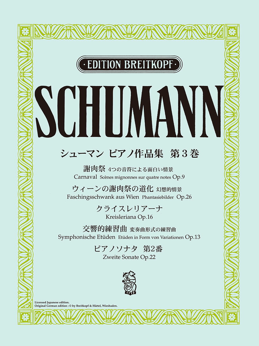 ブライトコプフ & ヘルテル社から出版されているシューマンのピアノ作品集全7巻より、「教材」または「演奏会用作品」として取り上げられる機会の多い作品を選び、全3巻に収録した。このシリーズは、シューマンの死後、当時一流のピアニストであった妻クララが刊行した最初の全集にウィルヘルム・ケンプが手を加えたもので、作曲家の周辺にいた音楽家たちの生きた提言が含まれる、極めて重要な版として知られている。※本書は「日本語ライセンス版 シューマン : ピアノ作品集 第3巻 謝肉祭 他」(GTP01094786)と同じ内容です。■収載曲 [全5曲を収載][1] 謝肉祭 OP.9Carnaval: Sc?nes mignonnes sur quatre notes OP.9[2] ウィーンの謝肉祭の道化 OP.26Faschingsschwank aus Wien Phantasiebilder OP.26[3] クライスレリアーナ Op.16Kreisleriana Op.16[4] 交響的練習曲 変奏曲形式の練習曲 Op.13Symphonische Et?den: Et?den in Form von Variationen Op.13[5] ピアノソナタ第2番 Op.22Zweite Sonate Op.22