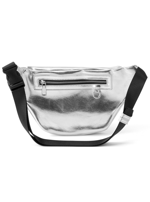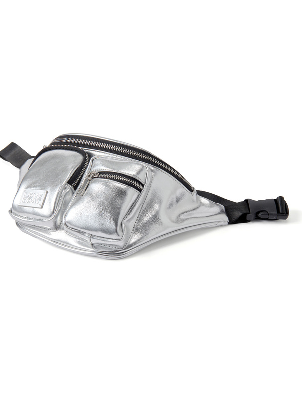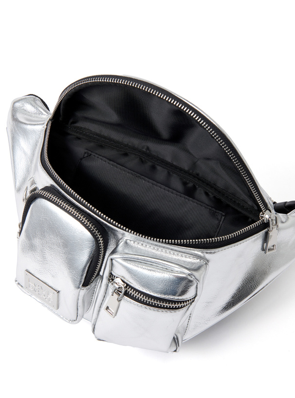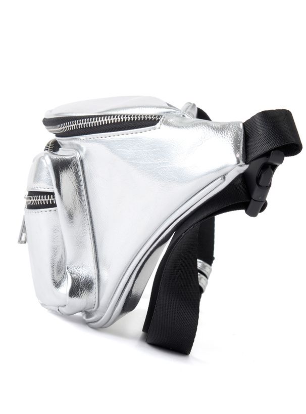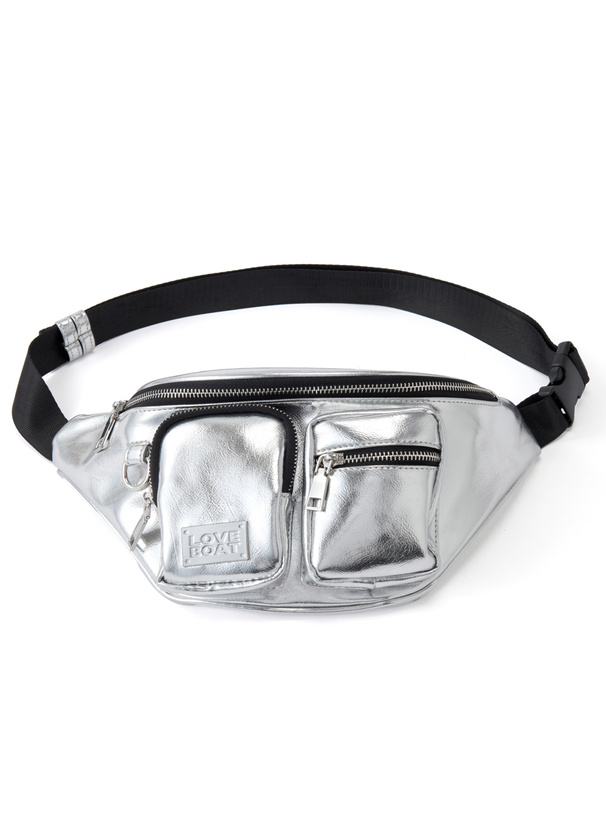 フロントのポケットとメタルプレートがアクセントになったウエストバッグ。