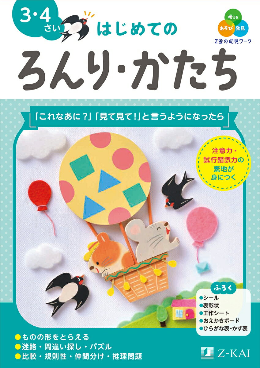 あそび・発見・考える Z会の幼児ワーク○、△、□といった形が分かってきた、どっちが大きい、小さいに気づくようになってきたお子さまにおすすめ迷路・間違い探し、パズルなどを通して試行錯誤する力を養いますZ会の幼児ワークは、子どもの「なぜ?」「知りたい」をふくらませ、未知の世界を切り拓く力を育みます。◎学ぶおもしろさを実感できます◎身のまわりのことに興味がひろがります◎自分で考える力が身につきます「はじめてのろんり・かたち 3・4さい」では・並び方の規則性を見出したり、クイズのように楽しみながら条件整理の考え方を学びます。実際に工作をしながら、空間図形や平面図形に親しめます。・迷路・間違い探し、パズルなどを通して、比較、仲間分け、条件整理をクイズのように楽しむ中で論理的に考える素地をつくります。・身近な物の形をとらえるワークに取り組みながら、次第に円、三角形、四角形のような図形の特徴を捉える力を培います。