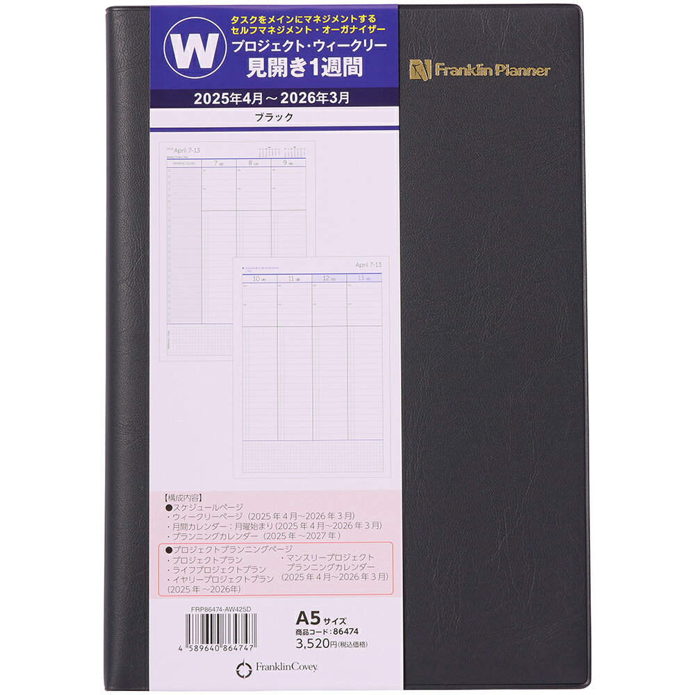 タスク管理を重視した見開き一週間タイプのオーガナイザー。2025年4月〜2026年3月までの4月始まり商品。自分自身の仕事だけでなく、プライベートもプロジェクトと捉え、プロジェクト管理の手法を理解しながら自分自身をマネジメントすることができる「セルフ・マネジメント」ダイアリーです。<特長>1.プロジェクト・プランニング〜年間〜日々の計画まで、「自らゴール設定し、計画をたてタスクを書き出し、優先順位を考え実行する」タスク管理を重視できるよう設計しました。2.プロジェクト・プランニングページが充実ライフ・プロジェクト、イヤリー・プロジェクトプラン、マンスリー・プロジェクトプラン、プロジェクトプランとプロジェクトに応じて年単位から月単位までプロジェクトごとに計画ができるところが魅力です。3.ウィークリーページには細かな時間軸は省き、AMとPMにのみ分けました。時間に重きを置くのではなく、タスクを書き出し、優先順位をつけ、実行することを日々積み重ねることでプロジェクトを達成する力をつけることができます。4.月間カレンダーは月曜日始まりです。●日付期間(掲載期間):月間:2025 年4 月〜 2026 年3 月 週間:2025 年4 月〜 2026 年3 月●罫内容:月間:ブロックタイプ 週間:バーチカルタイプ●記入欄:月間予定表ブロック式 週間予定表見開き1週間 月曜始まり●サイズ(判型):A5●寸法:タテ221×ヨコ152×厚み12mm●色:ブラック●表紙:PVC●中紙:上質紙●ページ数:176ページ