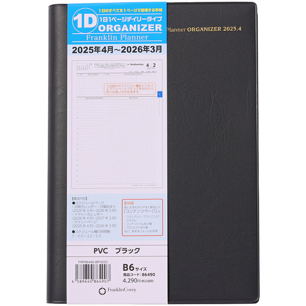 2025年4月〜2026年3月までの4月始まり商品。 全ラインナップ分冊版が好評な1日1ページ オーガナイザー。A5サイズとB6サイズをご用意しています。 カバー付商品は取り外し可能です。<特長>1.コンテンツ部分「プランナーガイド&フォーム」と「スケジュールページ」の2分冊版。コンテンツ部分は自宅やオフィスに置いて軽く持ち歩くことも可能です。2.一週間が8ページ構成。土曜日と日曜日のデイリーページを横並びにすることで、週末のスケジュールが立てやすくなりました。ウィークリー・プランニング(一週間コンパス)とウィークリー・タスクページが週の初めにレイアウトされているので一週間が始まる前に週の計画を立てるのに便利です。一週間コンパスは、ページ内に集約しました。3.デイリーページ内デイリータスク・リスト欄が3分割。「QⅡActivities」(第Ⅱ領域活動を計画)を記入する欄と、デイリータスク・リスト欄が2分割。タスク・リスト欄を2分割にすることでビジネスとプライベートに分けたり、色々な使い方が可能。4.デイリーページの時間軸は7時〜22時。5.月間カレンダーは月曜日始まりです。●日付期間(掲載期間):月間:2025 年3 月〜2026 年3 月 デイリー:2025 年4 月〜2026 年3 月●罫内容:月間:ブロックタイプ デイリー:1日1ページタイプ●記入欄:月間予定表ブロック式 デイリー予定表:1日1ページ 月曜始まり●サイズ(判型):B6●寸法:タテ192×ヨコ134×厚み23mm●色:ブラック●表紙:PVC●中紙:トモエリバーS●ページ数:本冊:464ページ 別冊:80ページ