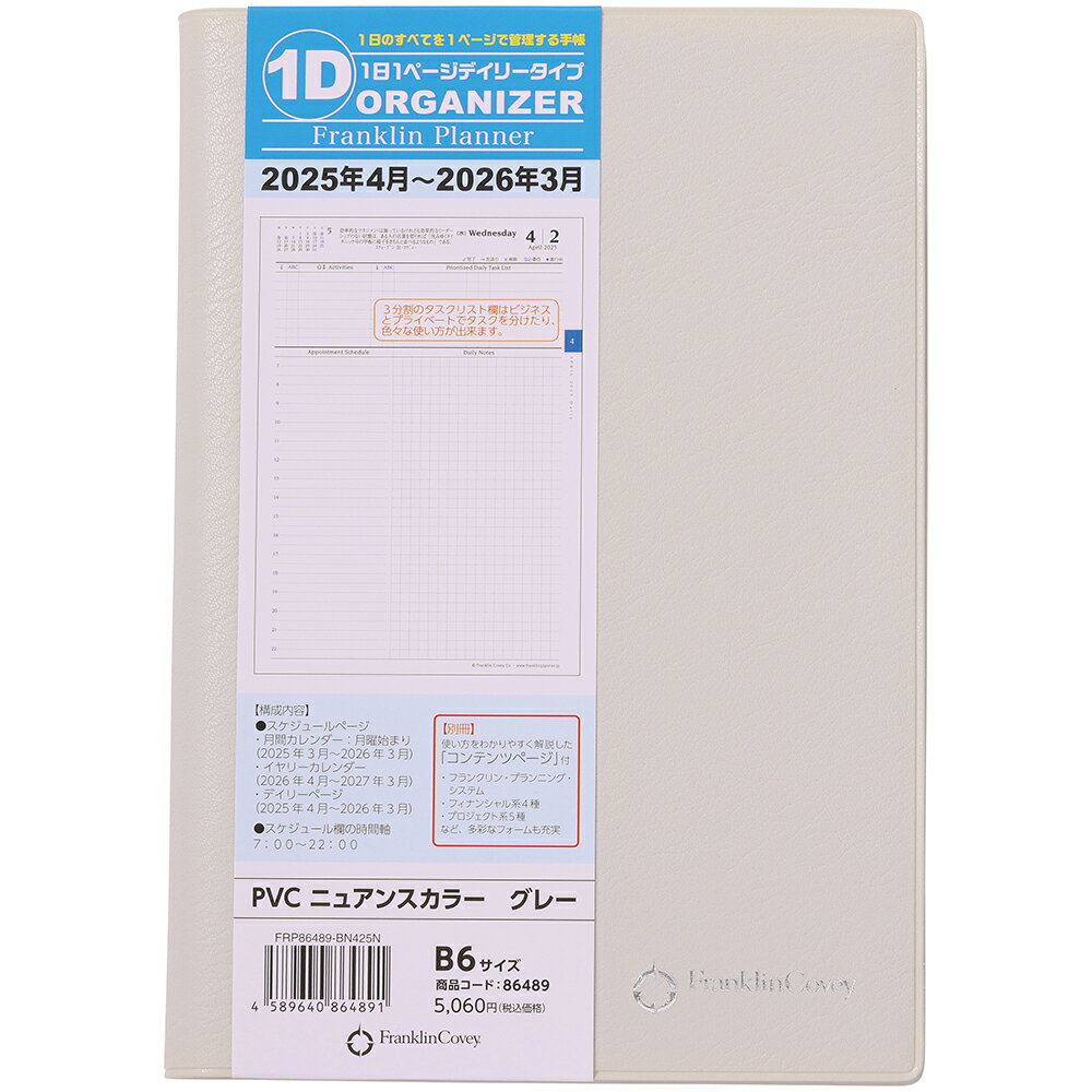 2025年4月〜2026年3月までの4月始まり商品。 全ラインナップ分冊版が好評な1日1ページ オーガナイザー。A5サイズとB6サイズをご用意しています。 カバー付商品は取り外し可能です。<特長>1.コンテンツ部分「プランナーガイド&フォーム」と「スケジュールページ」の2分冊版。コンテンツ部分は自宅やオフィスに置いて軽く持ち歩くことも可能です。2.一週間が8ページ構成。土曜日と日曜日のデイリーページを横並びにすることで、週末のスケジュールが立てやすくなりました。ウィークリー・プランニング(一週間コンパス)とウィークリー・タスクページが週の初めにレイアウトされているので一週間が始まる前に週の計画を立てるのに便利です。一週間コンパスは、ページ内に集約しました。3.デイリーページ内デイリータスク・リスト欄が3分割。「QⅡActivities」(第Ⅱ領域活動を計画)を記入する欄と、デイリータスク・リスト欄が2分割。タスク・リスト欄を2分割にすることでビジネスとプライベートに分けたり、色々な使い方が可能。4.デイリーページの時間軸は7時〜22時。5.月間カレンダーは月曜日始まりです。●日付期間(掲載期間):月間:2025 年3 月〜2026 年3 月 デイリー:2025 年4 月〜2026 年3 月●罫内容:月間:ブロックタイプ デイリー:1日1ページタイプ●記入欄:月間予定表ブロック式 デイリー予定表:1日1ページ 月曜始まり●サイズ(判型):B6●寸法:タテ192×ヨコ134×厚み23mm●色:グレー●表紙:PVC●中紙:トモエリバーS●ページ数:本冊:464ページ 別冊:80ページ