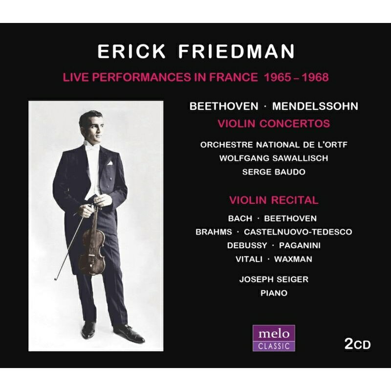 エリック・フリードマン/フランスでのライヴ録音集 1965-1968年エリック・フリードマン[1939-2004]は米国、ニュージャージー州ニューアーク生まれのヴァイオリニスト。6歳でジュリアード音楽院に入学するという神童で、ナタン・ミルシテインとヤッシャ・ハイフェッツから個人レッスンを受けていました。特にハイフェッツはフリードマンを可愛がり、1961年のバッハの2つのヴァイオリンのための協奏曲の録音で彼を第2ヴァイオリンに取り立てています。1966年のチャイコフスキー国際コンクールで第6位に入賞。国際的に大活躍をしていましたが、脂が乗り切るというところの1986年、テキサス州のハイウェイでの自動車事故で腕を負傷、演奏活動を断念して教職に転進しました。 この2CDには1960年代半ば、彼の20代後半の録音が集められています。高度に安定した技巧と自身に満ちた演奏は実に爽快。ベートーヴェンのヴァイオリン協奏曲では若き日のヴォルフガング・サヴァリッシュが伴奏指揮を受け持っています。(輸入元情報)【収録情報】1. ベートーヴェン:ヴァイオリン協奏曲ニ長調 Op.612. メンデルスゾーン:ヴァイオリン協奏曲ホ短調 Op.643. ヴィターリ:シャコンヌ ト短調4. ブラームス:ヴァイオリン・ソナタ第3番ニ短調 Op.1085. ドビュッシー:ヴァイオリン・ソナタ ト短調 L.1486. ベートーヴェン:ロマンス ヘ長調 Op.507. カステルヌオーヴォ=テデスコ:海のささやき8. パガニーニ:無窮動 Op.119. ワックスマン:カルメン・ファンタジー10. バッハ:無伴奏ヴァイオリン・ソナタ第1番 BWV.1001〜フーガ エリック・フリードマン(ヴァイオリン) ヴォルフガング・サヴァリッシュ指揮、フランス国立放送フィルハーモニー管弦楽団(1) セルジュ・ボド指揮、フランス国立放送フィルハーモニー管弦楽団(2) ジョセフ・シーガー(ピアノ:3) モノラル録音: 1965年9月12日 ブザンソン ライヴ録音(1) 1966年2月25日 パリ ライヴ録音(2) 1968年3月5日 パリ ライヴ録音(3)Powered by HMV