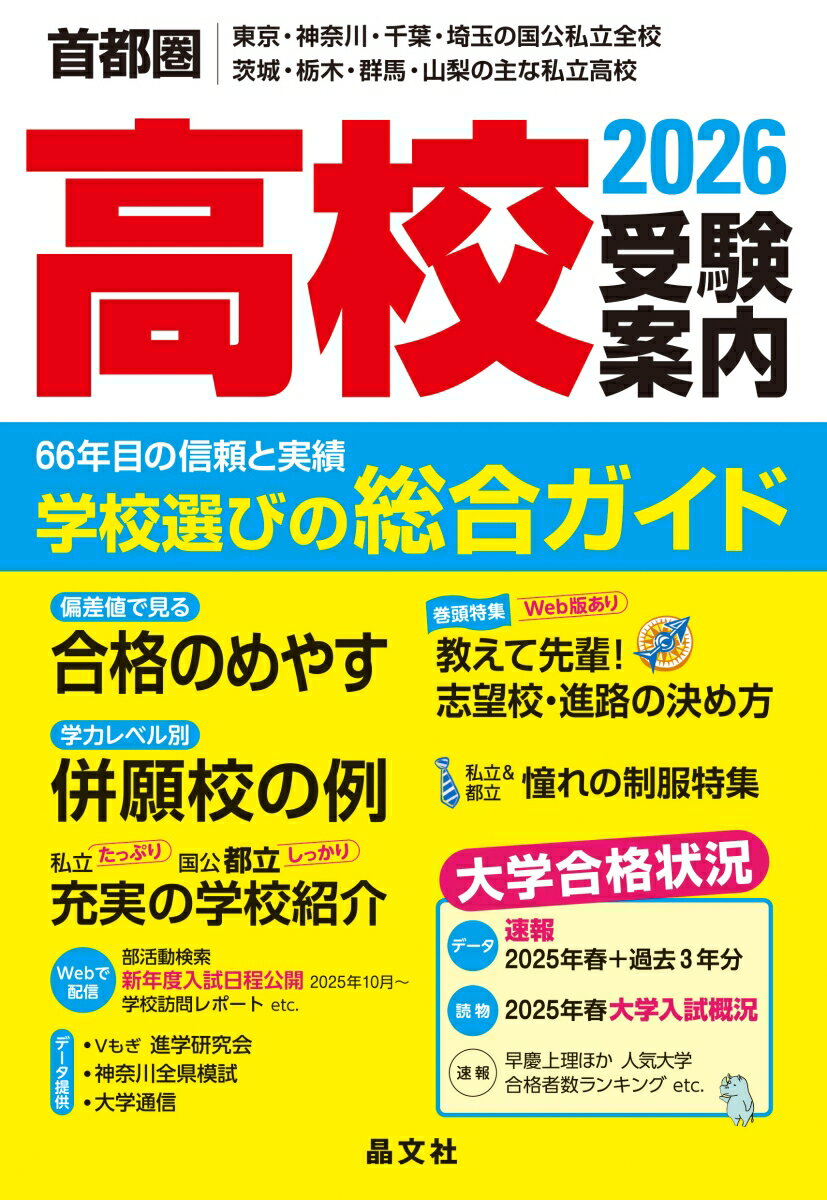 ★黄色い受験案内は受験生の必須アイテム東京・神奈川・千葉・埼玉の全高校、茨城・栃木・群馬・山梨の主な高校を私立・都公立別に配列。私立高校紹介ページは見やすい2色刷り。首都圏高校受験はこの一冊で!【各校のおもな掲載情報】教育理念、学科・コース編成、教育内容、クラブ活動、海外研修、施設、オンライン授業、土曜日の登校形態、進路情報、系列大学への進学状況、高校の入試要項・応募状況・合格最低点・推薦基準・偏差値とグラフで見る合格のめやす、学費、併願校の例など、情報満載!【巻頭カラーページ】「学校生活を彩る 憧れの制服特集」で私立&都立322校の制服写真を一挙掲載。女子用スラックスや自由選択制の有無、リニューアル情報などをアイコンで表示。【充実の解説・読物ページ】●巻頭特集「教えて先輩! 志望校・進路の決め方」では、私立高校卒業生にインタビュー。高校の志望校選びから、高校卒業後の進路選択に至るエピソードをレポートします。さらにWeb版の記事では、先輩方をサポートした学校の体制やキャリア教育の取り組みを詳しく紹介。●解説「志望校選びはココが大事! 高校入試のポイント」では、志望校を選ぶ際の着目点、私立・公立それぞれの入試の仕組み、受験パターンの組み立て方、学費と国や都県の支援金・助成金制度について説明します。●巻末読物「2025年春の大学入試はどう行われたか」では、入試概況を解説。大学の受験者数ランキング速報、早慶上理・GMARCH合格者数の高校ランキング速報も掲載します。【晶文社だけの特典情報】●進学研究会(Vもぎ)や伸学工房(神奈川全県模試)より提供されたデータに基づく「合格のめやす」を掲載。模擬試験の偏差値を参考に、学力に合った志望校を探しましょう。●書籍発行後の新情報をWebサイトで配信。学校訪問レポート、入試の変更事項などのほか、部活動検索もできます。2026年度入試日程は2025年10月〜順次公開予定。●「合格のめやす」はグラフ化し、一目瞭然。偏差値ごとの合否分布が視覚的に掴めます。●「併願校の例」は、地域別・学力段階別。さらに私立は公立・私立別で詳しく、受験パターンの参考になります。●都立・公立高校の情報充実。学校の特色や進路情報、合格のめやす、入試情報も紹介。●都立高校の大学合格状況は現役合格数がわかる貴重な資料。●大学合格状況は最新2025年春+過去3年分で近年の推移がわかります。●「学力段階表」は1枚に全校を収載した使いやすい資料です。都県別表記なので、通学区域を考えながら、志望校を選べます。