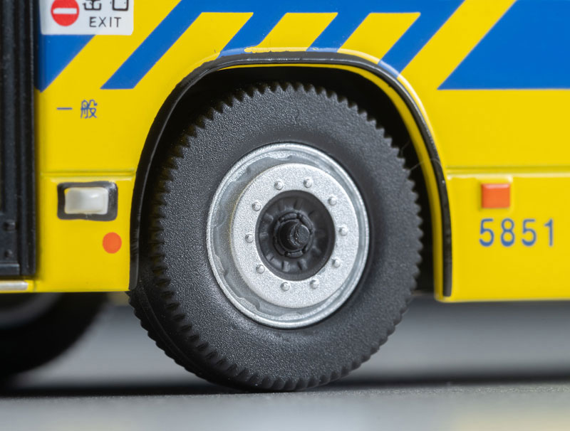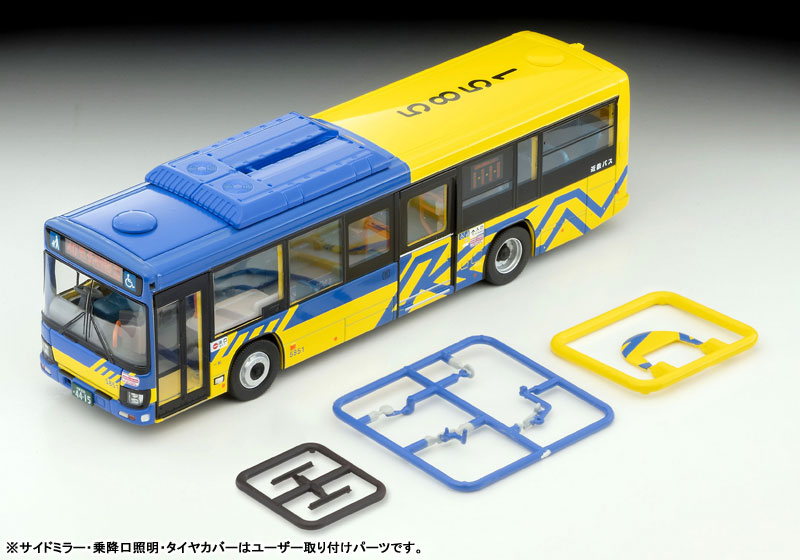 本製品では東大阪市にある枚岡営業所のいすゞエルガをプロトタイプとし、実車の表記類やステッカーを再現。独特な形状のタイヤカバーも新規パーツで再現しています。発売中のジオコレ64 #カースナップ バス停と組み合わせても楽しさが広がります。