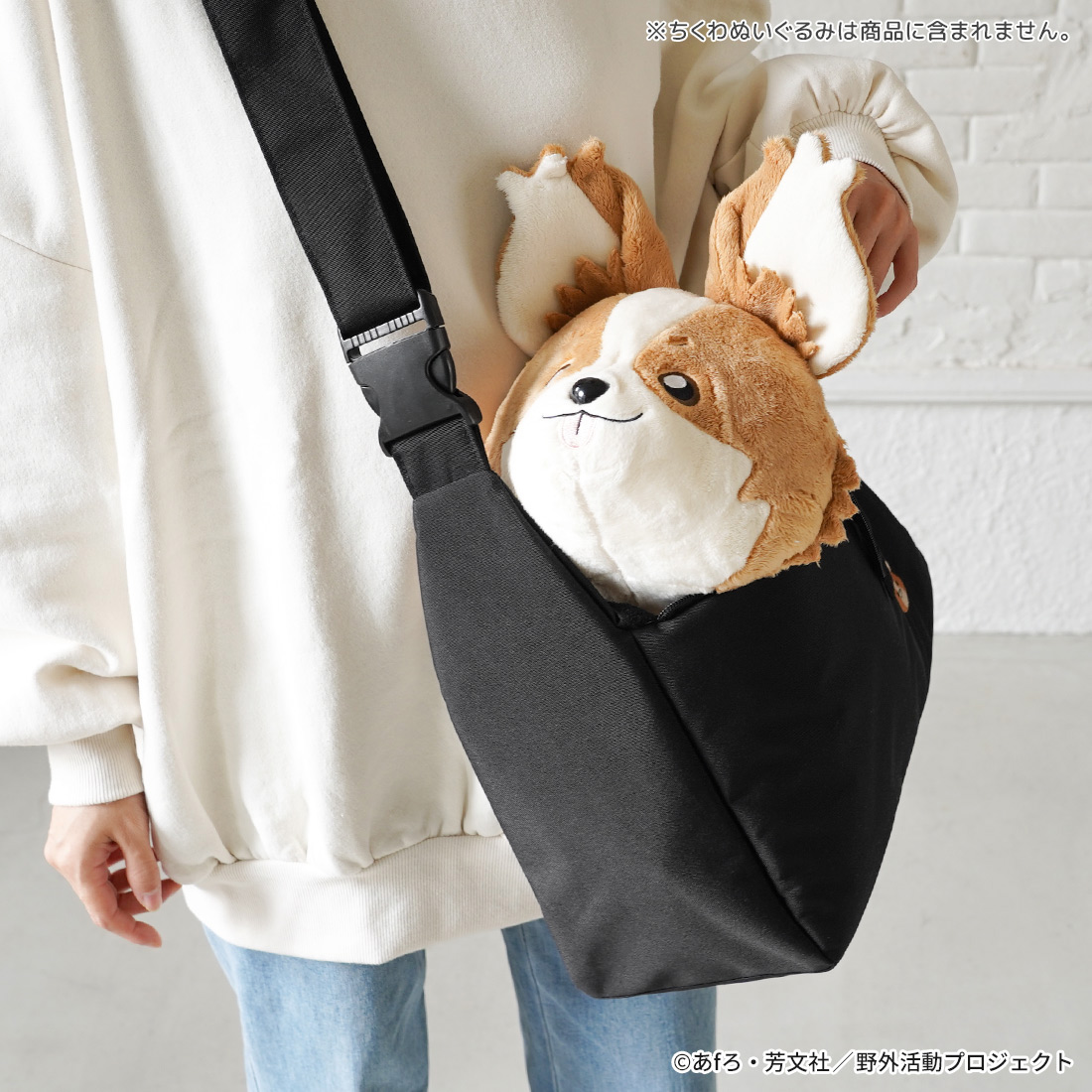 ちくわのぬいぐるみ(別売)や、実際の愛犬とのお散歩に使っていただけるショルダーバッグです。