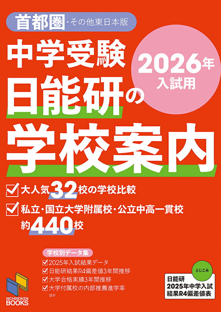首都圏・その他東日本の私立・国立大学附属校・公立中高一貫校、約440校の校風、歴史、宗教、生徒数、環境・施設、カリキュラム、行事、クラブ、学校生活などをアイコンとともに詳細に紹介。さらに、日能研の中学入試結果R4偏差値3年間推移、大学合格実績3年間推移、大学付属校の内部推薦進学率など、日能研ならではの学校別データも満載です。【PART1】大人気32校の学校比較編【PART2】中高一貫校学校紹介編[首都圏]東京・神奈川・千葉・埼玉・茨城・静岡 私立男子校 私立女子校 私立共学校 国立大学附属校 公立中高一貫校[東日本のその他]北海道・茨城・栃木・群馬・山梨・長野・東京・神奈川・千葉・静岡【PART3】データ編(1)2025年入試要項&入試結果データ一覧(2)2024年春 私立・国立・公立一貫校 大学合格実績(3)2024年春 大学付属校の内部推薦進学率【巻末マップ】首都圏私立・国立・公立329校の『学校歩きマップ』【とじこみ】日能研全国公開模試 2025年中学入試結果R4一覧