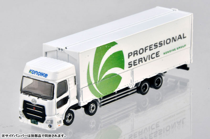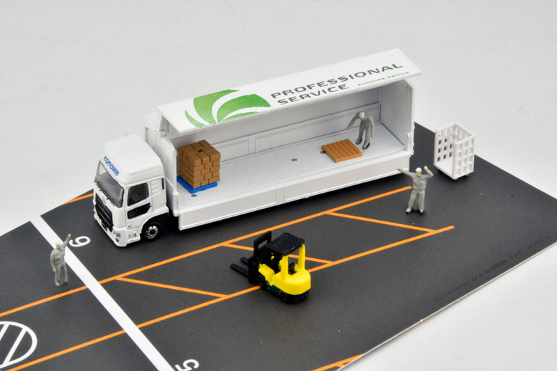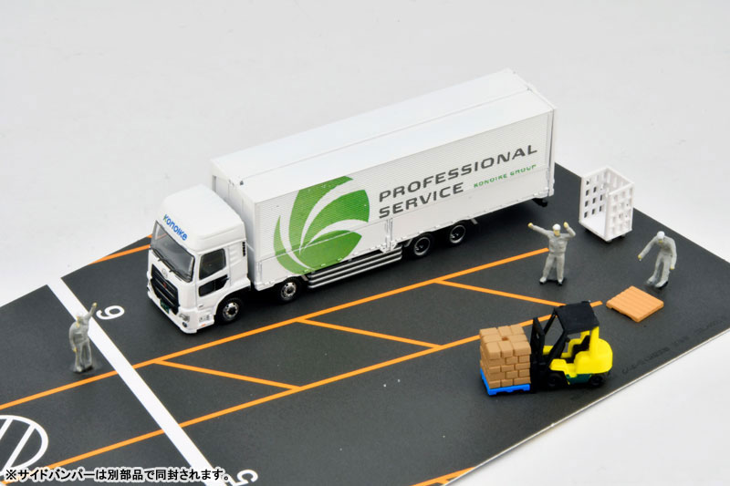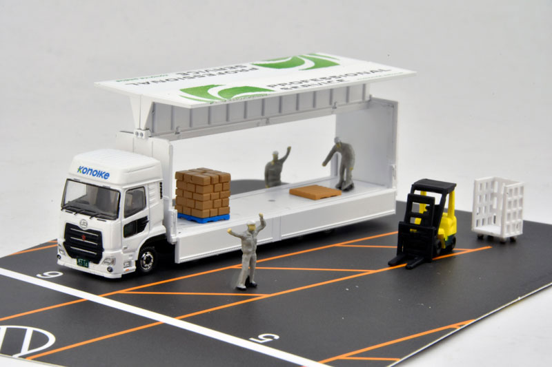 Nゲージ・塗装組立済 【スケール】1/150 【セット内容一覧】 UDトラックス クオン(現行モデル)ウィングバン フォークリフト 荷台カーゴ 集積カートン 空パレット フィギュア(現場作業員3体) 展示用背景台紙(両面印刷)1枚