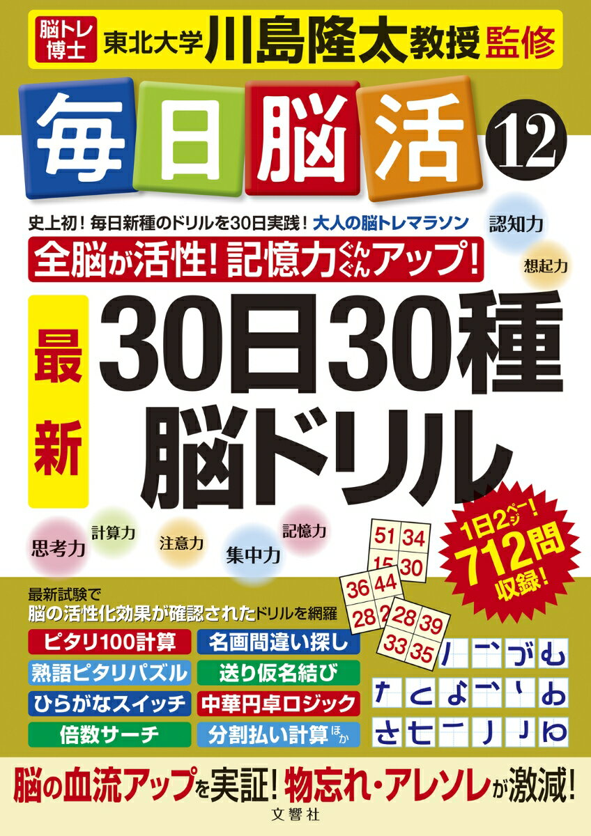 脳科学の第一人者として著名な東北大学・川島隆太教授が全シリーズを監修。脳機能の試験で高い効果が得られたドリルを中心に収録し、30日間、毎日違った種類の問題を飽きずに楽しめる、脳活ドリルの決定版です。大きな文字で見やすい・答えが書きやすい特別仕様の紙面で、漢字・言葉・計算パズルやイラスト間違い探しなど、遊びながら脳が鍛えられるのも特長。川島教授が60〜70代を対象に行った試験で「脳の司令塔」ともいえる前頭前野の血流を増やす効果を科学的に実証。加齢とともに衰えやすい「記憶力」「認知力」「注意力」「集中力」「思考力」「想起力」「計算力」の7大脳力をぐんぐん向上させます。