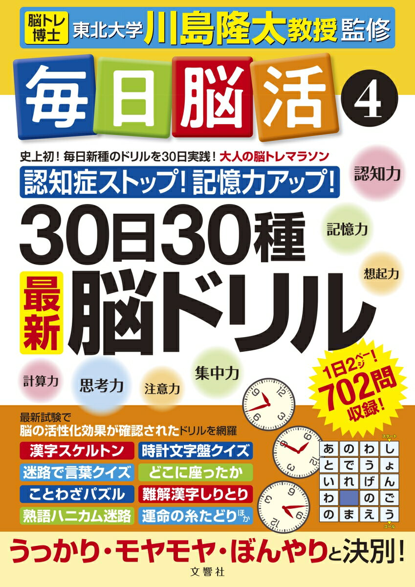 脳トレ博士・東北大学・川島隆太教授が効果を確認した「30日30種脳ドリル」第4弾毎日新種のドリルのチャレンジで脳がみるみる活性化!「会話の途中で人や物の名前が出てこない」「何をやるにも腰が重くなった」「突然カッとすることが増えた」──これらはいずれも脳が衰えているサイン。脳の機能は20代を過ぎたころから低下するといわれています。しかし、脳に新しい刺激を毎日与えることで脳の衰えを防ぐばかりか、いくつになっても記憶力や集中力が向上し、意欲や冷静さを取り戻すことも十分可能です。本書は漢字系・計算系・パズル系など多彩なドリルが満載で、脳の司令塔「前頭前野」の血流を増やすことが確かめられたドリルを収録。大判・大きな文字の開きやすい・書きやすい特別仕様で、1日2ページ飽きずに楽しく実践できます。