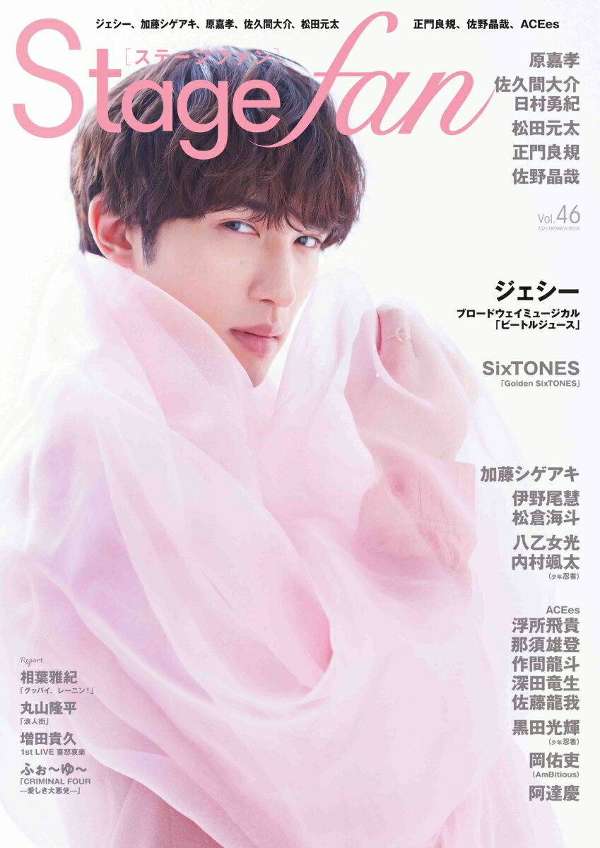 Stage fan Vol.46(ステージファン) 3月26日(水)発売!【Cover】ジェシーミュージカル「ビートルジュース」【Interview】SixTONES新番組「Golden SixTONES」加藤シゲアキ 舞台「エドモン〜『シラノ・ド・ベルジュラック』を書いた男〜」伊野尾慧松倉海斗ドラマ「パラレル夫婦 死んだ“僕と妻”の真実」八乙女光内村颯太(少年忍者)舞台「Bug Parade」原嘉孝 舞台「Take Me Out」佐久間大介日村勇紀新番組「サクサクヒムヒム ☆推しの降る夜☆」松田元太ドラマ「人事の人見」正門良規ドラマ「ムサシノ輪舞曲」佐野晶哉ドラマ「Dr.アシュラ」ACEes浮所飛貴那須雄登作間龍斗深田竜生佐藤龍我黒田光輝(少年忍者)ミュージカル「魔女の宅急便」岡佑吏(AmBitious)舞台「家政夫のミタゾノ THE STAGE レ・ミゼラ風呂」阿達慶映画「リライト」初夏公開の注目ジュニア【Report】相葉雅紀「グッバイ、レーニン!」丸山隆平「浪人街」増田貴久1st LIVE 喜怒哀楽ふぉ〜ゆ〜「CRIMINAL FOUR -愛しき大悪党ー」