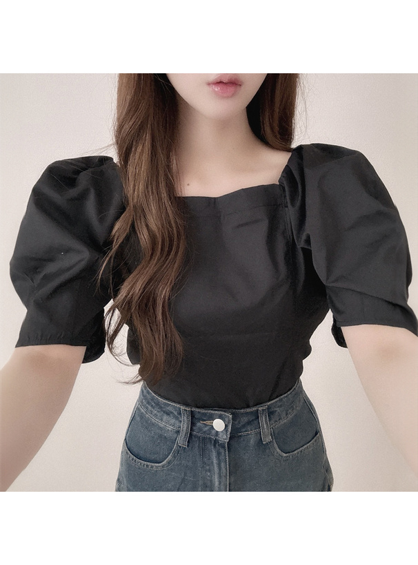 ボリューム感のあるパフスリーブが女性らしさを引き立てる。
