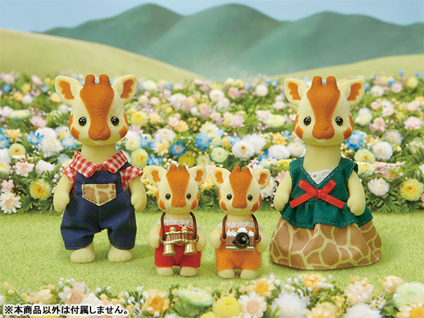 長い首と素敵な模様がチャーミングなキリンファミリーです。お父さん、お母さん、赤ちゃんふたりの4にんセットです。 赤ちゃん用のカメラと双眼鏡もついています。