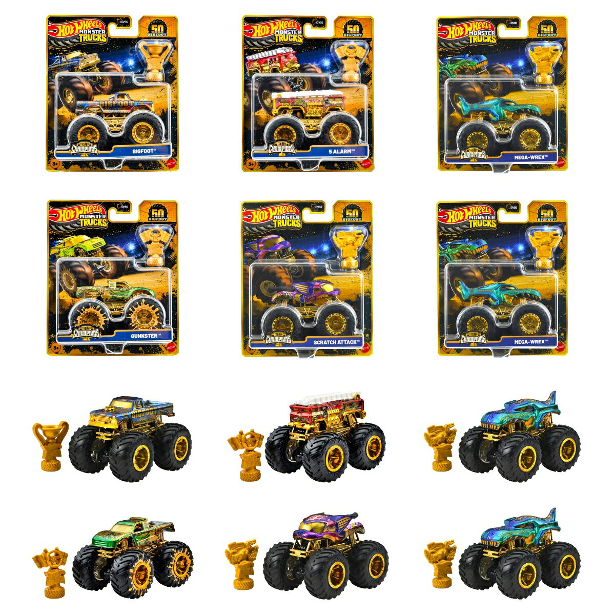 【内容】モンスタートラックの元祖、ビッグフットの50周年を記念したスペシャルなアソートが登場!1/64のモンスタートラックに、モンスタートラックライブの優勝トロフィーがセットになったアソートとなっています。【内訳】ビッグフット(Bigfoot®)x1、ガンクスター(Gunkster™)x1、ファイブ・アラーム(5 Alarm™)x1、メガ・レックス(Mega-Wrex™)x2、スクラッチ・アタック(Scratch Attack™)x1、合計6点【原産国】タイ 【対象年齢】3歳〜【BOX入り】BOX販売のため、専用の段ボールに入っています。専用段ボールは商品がピッタリ収まるため、大切なコレクションを保管するのに最適です。【Brandについて】カリフォルニア生まれ 1秒間に16台売れているミニカー。【ホットウィール】Hot Wheels=「かっこいい車!」独特な南カルフォルニア風の外観、高速に動くホイール、(当時の最新技術!)そして 赤いラインの入ったタイヤ。現在、世界で一番売れているミニカーです*。*Circana/Retail Tracking Service/G12/JAN-DEC 2023/Total Toys/Projected Units【プレゼントに最適】お誕生日、クリスマスプレゼント、入園・入学祝いなど記念日でのプレゼントにぴったりです。【対象年齢】:3歳以上【商品サイズ (cm)】(幅×高さ×奥行):14×16.5×6.7