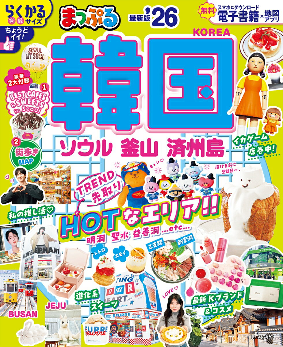 今行きたい韓国、トレンド情報が満載!ソウル・プサン・済州島の行くべきスポットをご紹介します。巻頭特集は、"トレンド先取り!韓国NEWS TOPICS”。注目ショップや話題のカフェ、人気エリアや韓国を席巻しているイカゲームグッズなどを一挙公開。ソウルの超話題の激アツエリア街歩き特集では、明洞・聖水洞・益善洞・・などの人気スポットやショップが盛りだくさん!巻頭は、豪華2大冊子付録。「BEST CAFE'S&SWEETS in Seoul &ソウル・プサン・済州島のお役立ちMAP」付き。【注目1】最新&話題のネタを徹底調査!トレンド先取り!韓国NEWS&TOPICS注目SHOP(コスメ、Kブランド、雑貨)話題の店&カフェ(黒白料理人、進化系クロワッサン、行列ベーカリー、スタバ)「イカゲーム」が韓国中を席巻!人気のハップル(新堂洞、乙支路3街)【注目2】ソウル激アツエリア街歩き(明洞、聖水洞、益善洞、安国など)K-POP推し活 聖地へGO!迷ったらココ!殿堂おいしい店10選絶品グルメ50市場グルメ大集合ビューティアドレス11(聖水の路面店、オリヤンは必須、韓国フレグランス)韓国ブランドSHOPとっておきの韓国雑貨韓国っぽ体験を楽しみたいおすすめ夜遊びスポット韓国エステエリア別おすすめスポット【注目3】プサン・慶州プサンの最旬&注目トピックス今行くべきプサンのNEW HOT PLACE絶品ご当地グルメ勢ぞろいグルメ、市場、ショップ、見どころなど慶州1dayトリップ【注目4】済州島済州島の最旬&注目トピックスパワースポットグルメ、ショップ、見どころなど●収録エリアソウル プサン 慶州 済州島シリーズ特長●国内・海外の「王道・定番」「最旬」旅行情報を紹介する雑誌スタイルの旅行ガイドシリーズ。軽くて持ち歩きにもちょうどイイ「トラベラーズサイズ」で、旅行前のプランニングはもちろん旅先でも大活躍!●アップデートされた情報が満載●地図は、旅先での探しやすさ、見やすさを追求した専用の仕様●無料アプリ「まっぷるリンク」をダウンロードすることで、スマホで使えて便利な電子書籍も見られます(iPhone/Android対応)