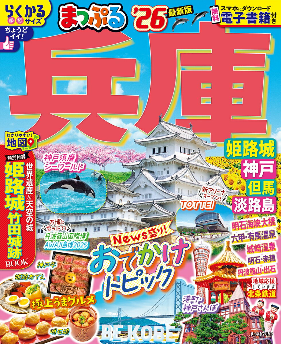 世界遺産姫路城と天空の城竹田城跡を別冊付録で徹底紹介!本誌では姫路の名物あなごめしや南京町の中華街ランチ情報、丹波・篠山の黒豆&栗スイーツなど兵庫ならではのグルメ情報が満載。姫路城からひと足のばして書寫山圓教寺へ訪れたり、赤穂坂越の町さんぽ、有馬温泉日帰りグルメを満喫、丹波篠山の注目ショップめぐりなど、休日のおでかけにぴったりなプランも。おしゃれな港町・神戸、城崎温泉、淡路島など定番エリア情報もばっちり。兵庫の楽しみ方がギュギュッと詰まった1冊です。【注目1】特別付録 姫路城・竹田城跡BOOK世界遺産姫路城 大天守CLOSE UP姫路城場内見学シミュレーション姫路城周辺の立ち寄りスポット天空の城竹田城跡など【注目2】兵庫 最旬NEWS & TOPICSAWAJI島博丹波篠山国際博姫路城近くの古民家カフェ神戸にエンタメ施設が続々オープン!新たな仕掛けで進化を続ける城崎温泉一度は行きたい!花映えスポットなど【注目3】兵庫おでかけプラン神戸〜姫路 人気スポット満喫丹波篠山 話題ショップめぐり坂越 ぶらり町歩き砥峰高原 さわやかハイキング【注目4】エリア別特集姫路 姫路城とご当地グルメめぐりプラン/姫路名物ランチ神戸 異人館めぐり/ベイエリアへ行こう!有馬温泉 ランチ&みやげ/おすすめの宿●収録エリア姫路・播磨(姫路城・龍野・赤穂・明石)/神戸タウン(北野・メリケンパーク・南京町)/有馬・六甲/但馬・城崎(竹田城跡・城崎温泉・出石・湯村温泉)/丹波・篠山/淡路島シリーズ特長●国内・海外の「王道・定番」「最旬」旅行情報を紹介する雑誌スタイルの旅行ガイドシリーズ。軽くて持ち歩きにもちょうどイイ「トラベラーズサイズ」で、旅行前のプランニングはもちろん旅先でも大活躍!●国内版では、編集部が推す地域の見どころ・伝統的な取り組みを紹介する新コーナー「まっぷる地域応援プロジェクト」が、多様な旅のスタイルにもお応えします!●地図は、旅先での探しやすさ、見やすさを追求した専用の仕様●無料アプリ「まっぷるリンク」をダウンロードすることで、スマホで使えて便利な電子書籍も見られます(iPhone/Android対応)
