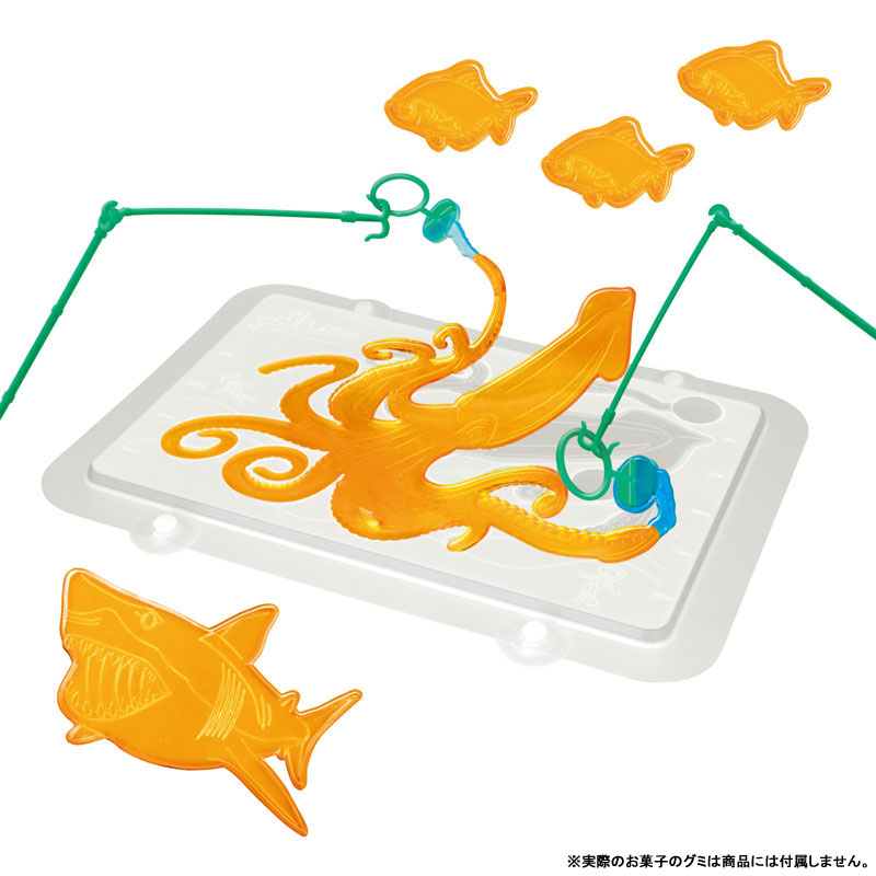 今までにない超巨大なグミが作れるキットです。 市販の材料を用意してセット内容の型に流し固める事で、3つのサイズのグミが作れます。 作ったグミは付属の釣り竿を使って釣りバトルができます。 2人でも、1人でも遊べるデザインのグミが作れます。