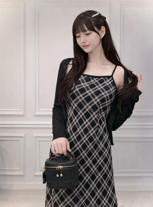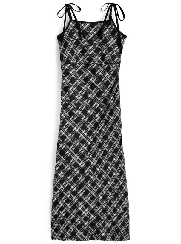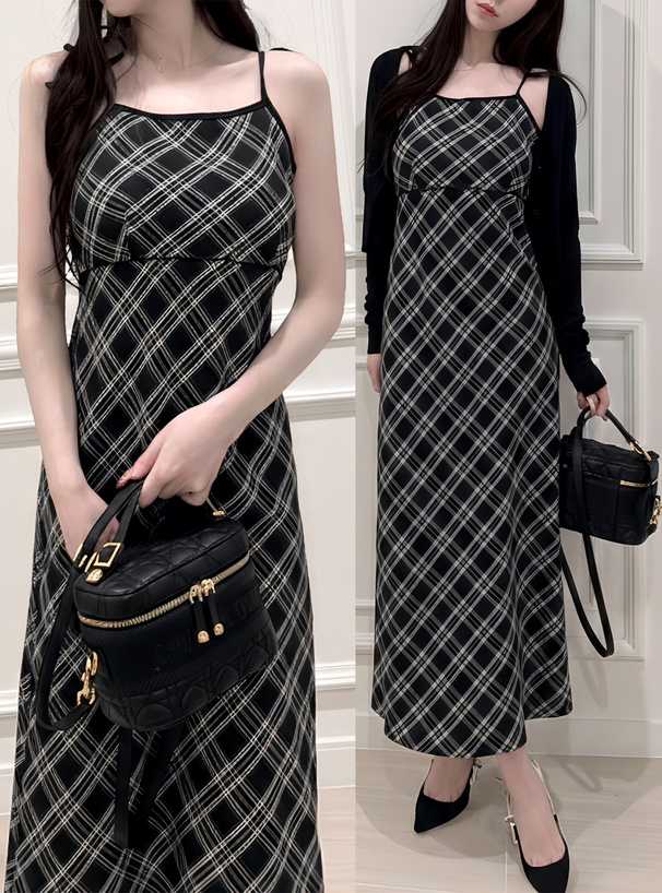 斜めに取ったバイアスチェック柄が視線を誘い、こなれ感を生むマキシワンピース。